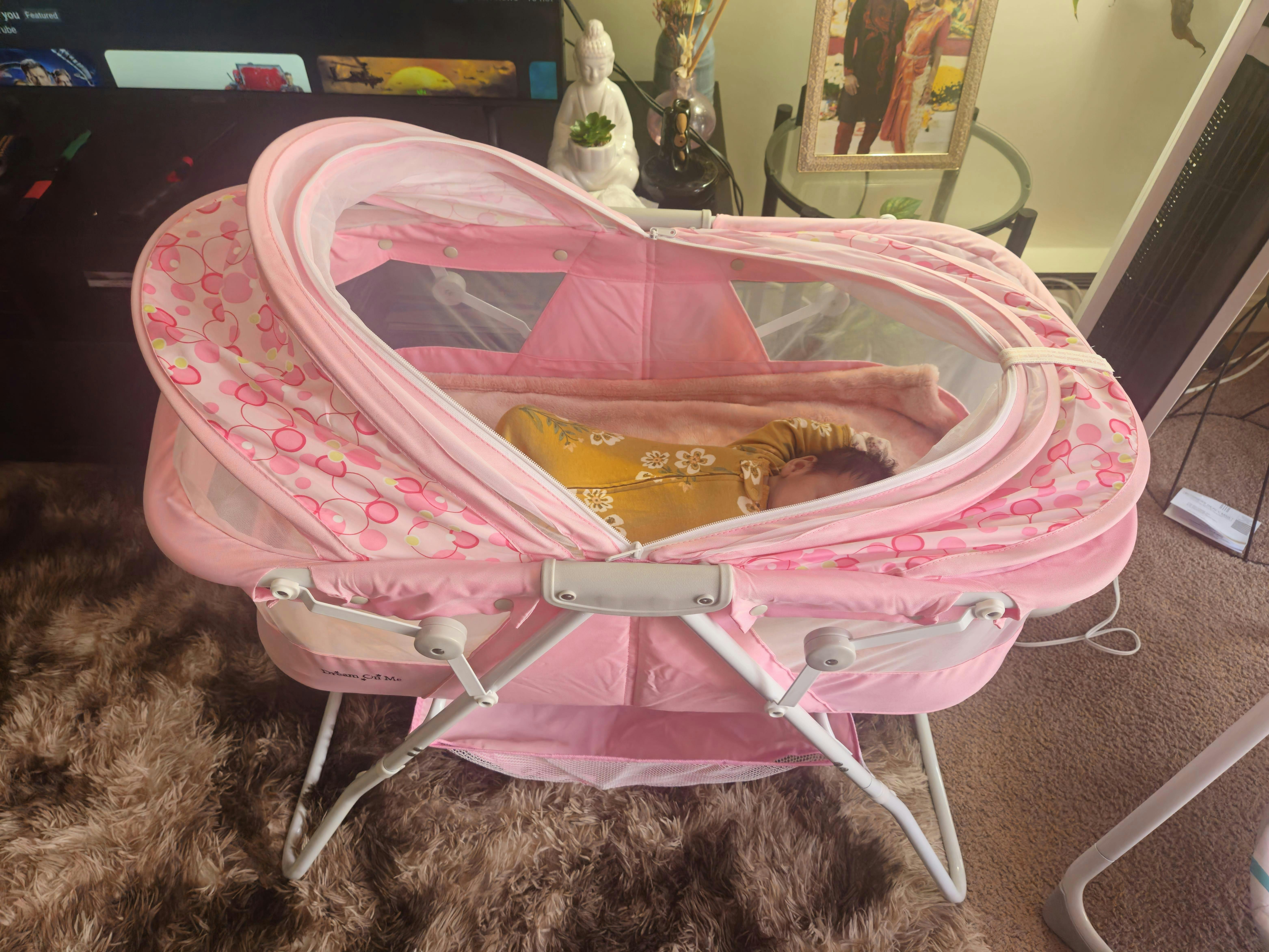 - COMFORT FOR YOUR NEWBORN: Made of Polyester foam fabric, the Karley Plus Portable Bassinet features a removable double canopy and sleeping pad for sound sleep and extra support.