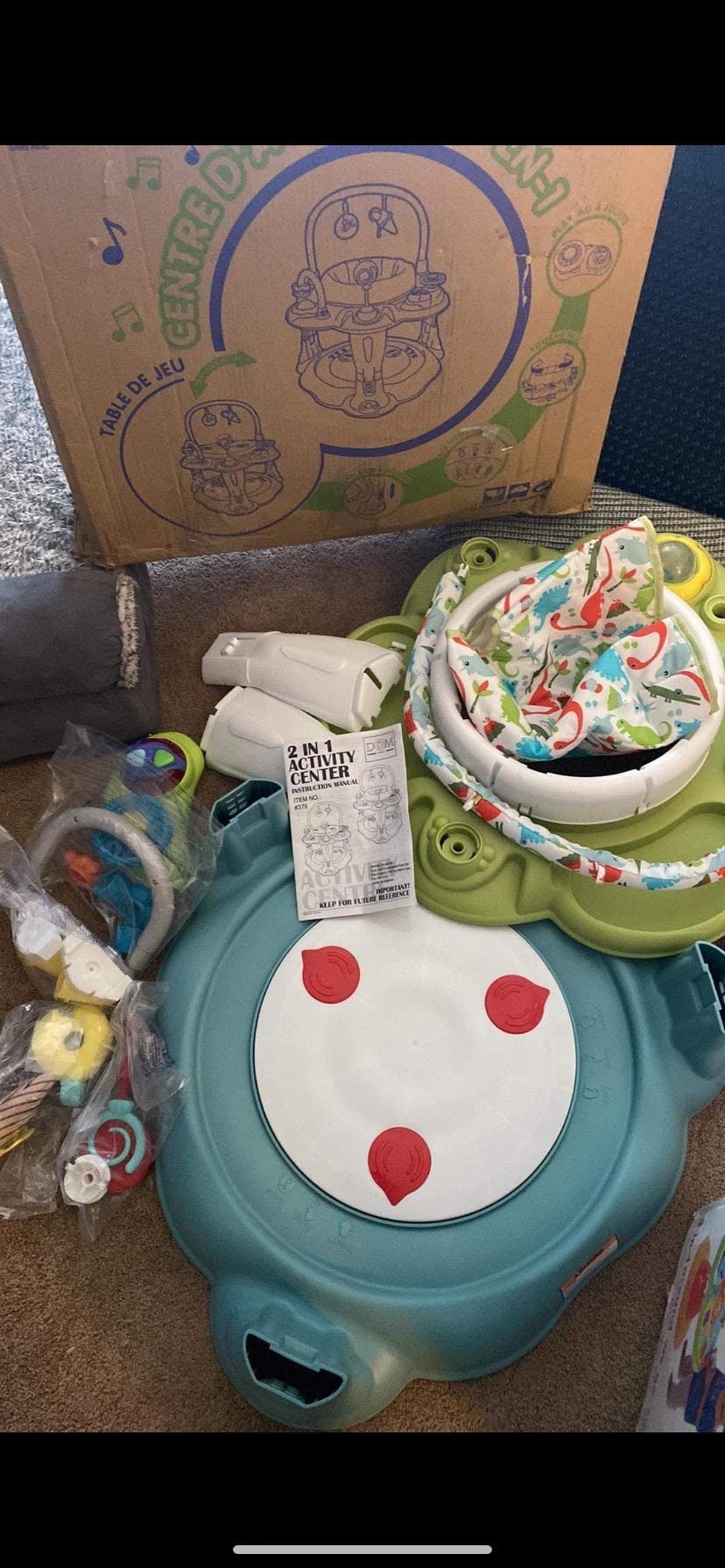 - This activity center features tons of activities that help infants and toddlers from 4 months to walking age in key early child development areas like core leg strength, reaching and stretching, and spine and neck development.