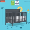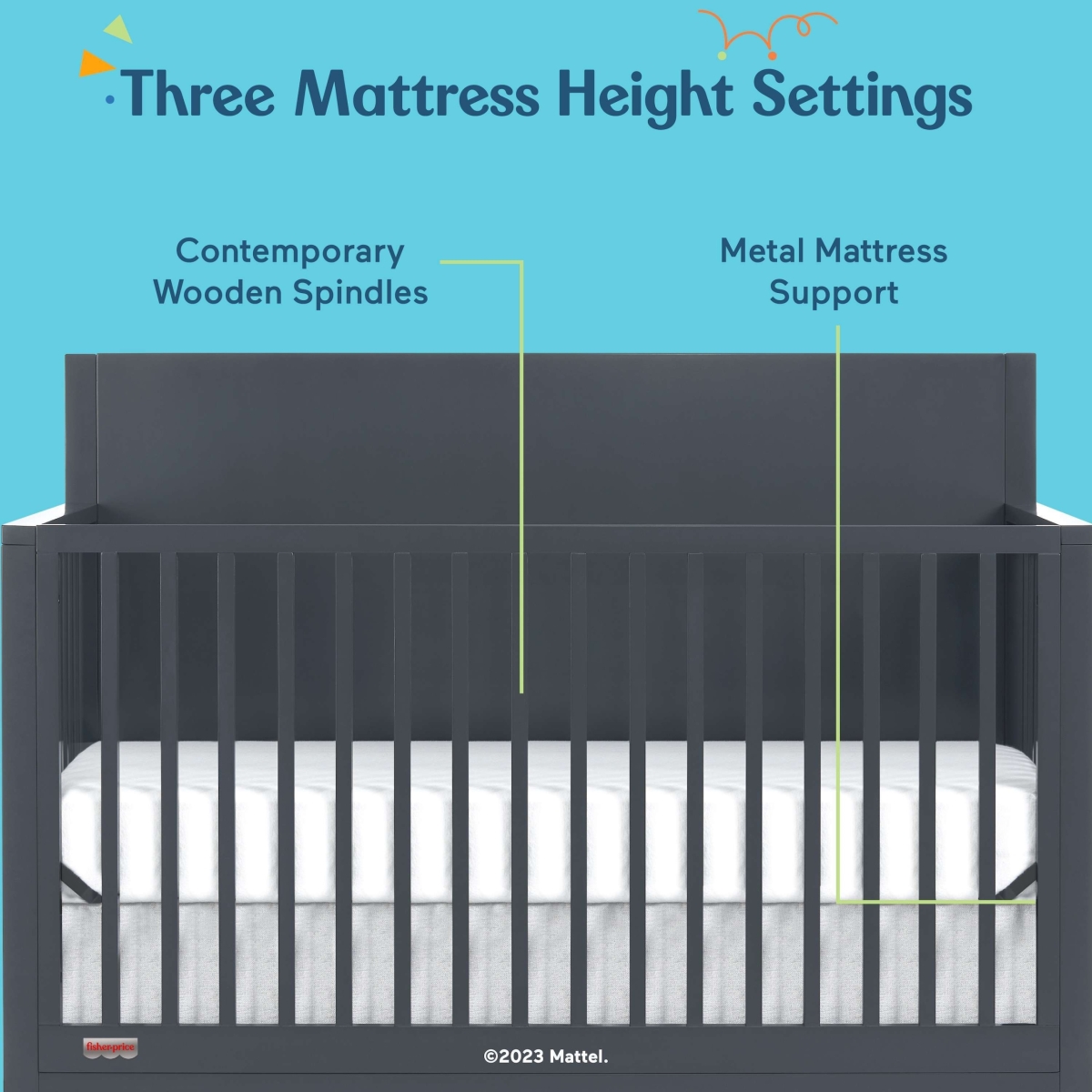 Be it some restful downtime or fun-filled playtime, your little dreamer deserves only the best. And that’s exactly what the all-new Fisher-Price by Dream On Me Delani 5-in-1 Convertible Crib brings – a snug oasis for ultimate relaxation! Crafted to seamlessly grow along with your little one, this crib transitions to a toddler bed, daybed and full-size bed (Conversion kit sold separately). With your child’s safety being our top priority, the Fisher-Price by Dream On Me Delani 5-in-1 Convertible Crib is BSA & Greenguard Gold certified and meets/exceeds ASTM and CPSC standards. Built with durable New Zealand Pinewood and sturdy wooden spindles, this crib is complete with a child-safe, non-toxic finish. Easy to spot or wipe clean, the Fisher-Price by Dream On Me Delani 5-in-1 Convertible Crib involves very low maintenance. Available in a versatile Carbon finish, bring this wonderful haven of comfort and joy into your child’s life. Product dimensions are 54 1/2″ L x 29 5/8″ W x 44 3/8″ H, with a weight of 72.75 Lbs and a maximum weight limit of 50 Lbs.