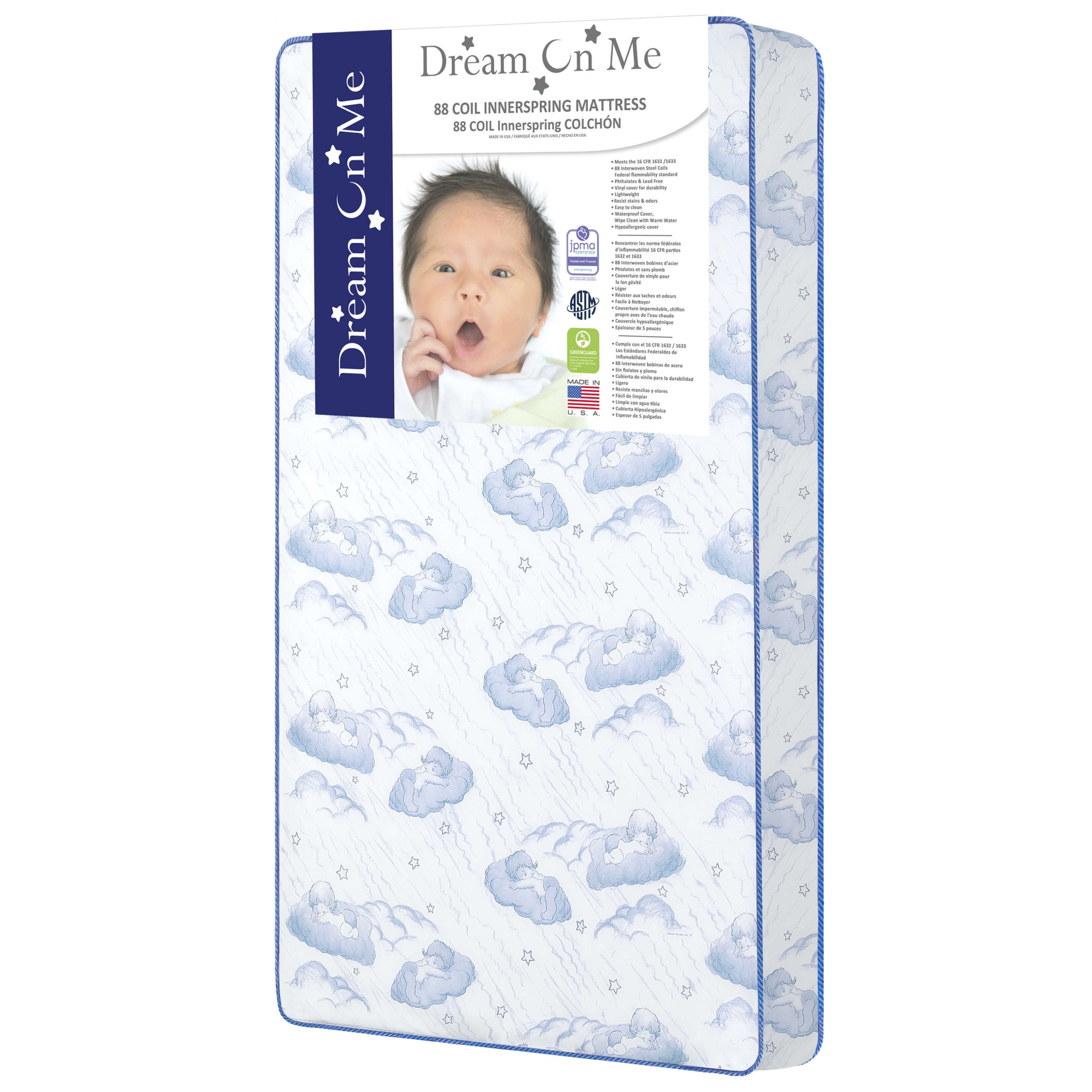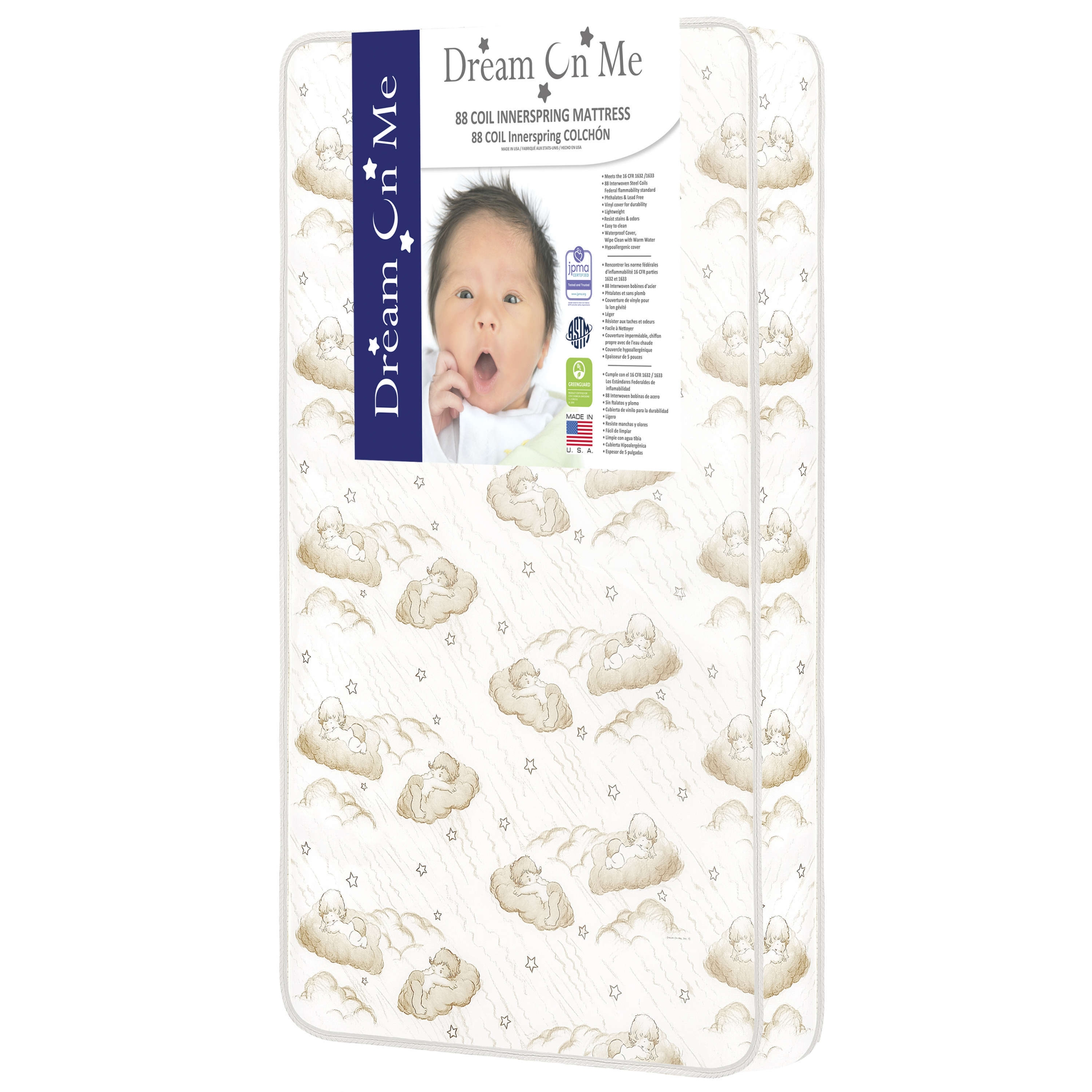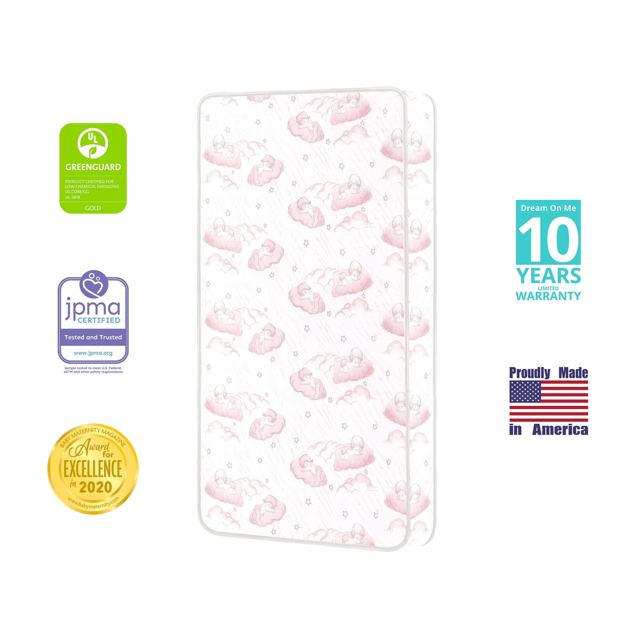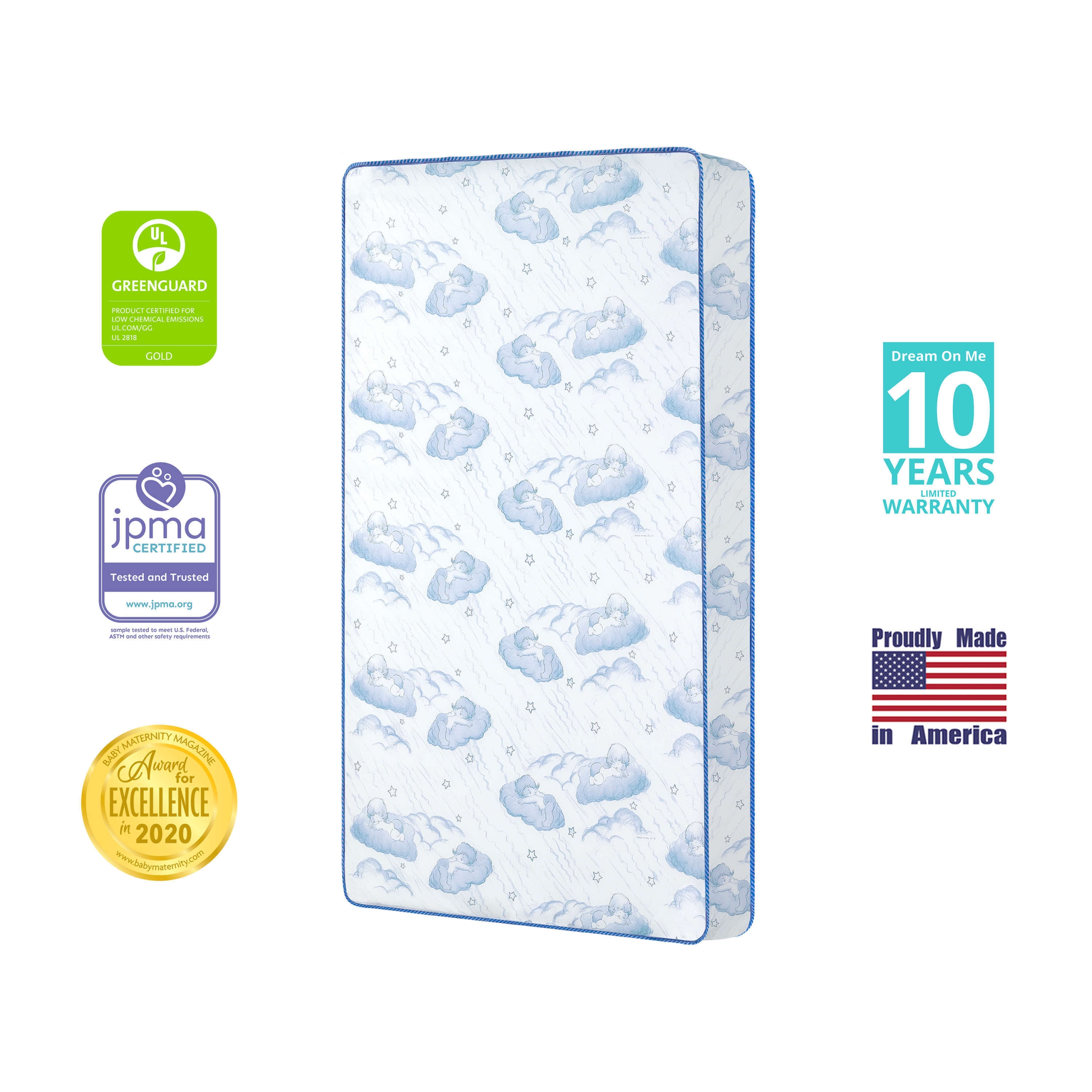 The award-winning Sweet Dreams 6 Inch 88 Coil Spring Crib And Toddler Bed Mattress is a safe, comfortable and durable mattress that fits a slew of full-size cribs and toddler beds. It’s Greenguard Gold Certified to ensure the highest level of health and safety. Our mattresses are JPMA certified, meet/exceed CPSC/ASTM safety standards and pass all flammability (16 CFR 1632/1633) tests. This lightweight yet feature-heavy mattress received the Award for Excellence in 2020 by Baby Maternity Magazine. Features include durable lock-stitched waterproof binding, and a triple laminated waterproof cover that resists stains and leakages inside, while airflow pockets ensure breathability. Choose from 3 stylish finishes! Our high-quality mattresses are designed, engineered and proudly Made in the USA using environmentally friendly, recyclable non-toxic materials. It comes with a 10-year limited warranty.