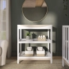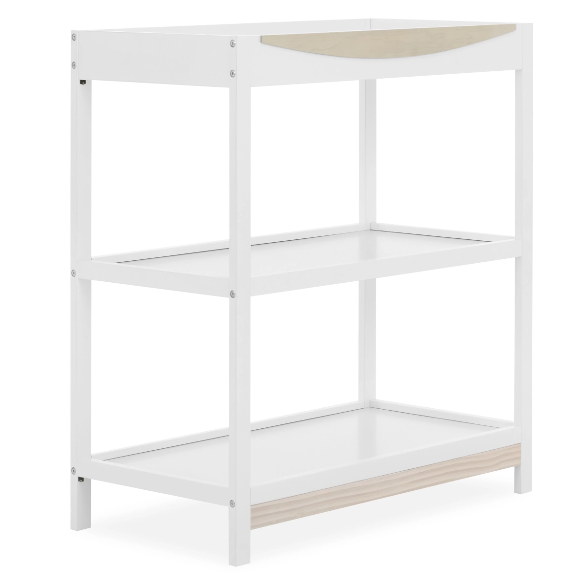 The Dream On Me Emerson Changing Table is a stylish and functional nursery essential, designed to make diaper changes effortless. Crafted with a sleek, modern aesthetic, it features two open shelves for easy storage of diapers, wipes, and baby essentials. The sturdy construction ensures durability, while the water-based paint finish provides a safe and non-toxic environment for your baby. With its compact footprint, this changing table is perfect for small spaces while offering ample storage. The raised safety rail surrounds the changing area for added security, and adding one of our changing pads (sold separately) offers a comfortable surface for your little one. Available in our timeless White and Vintage Oak finish, the Emerson Changing Table seamlessly complements any nursery décor. Product dimensions are 34.2″ L x 18.1″ W x 38.1″ H.
