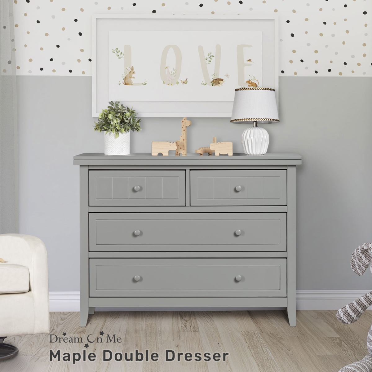 Dream On Me Maple Universal 4 Drawers Dresser captures the comfort and relaxing farmhouse elements with its classic framed plank pattern. This dresser is a great addition to your child’s nursery or bedroom. The wooden drawer pulls, clean lines and tapered feet compliment the refreshing finishes, while the four spacious drawers provide room for clothing and accessories. This Dream On Me 4 drawers dresser is crafted from durable solid wood, to work effortlessly throughout the years. This Dresser offers a little rustic charm to an ageless nursery.