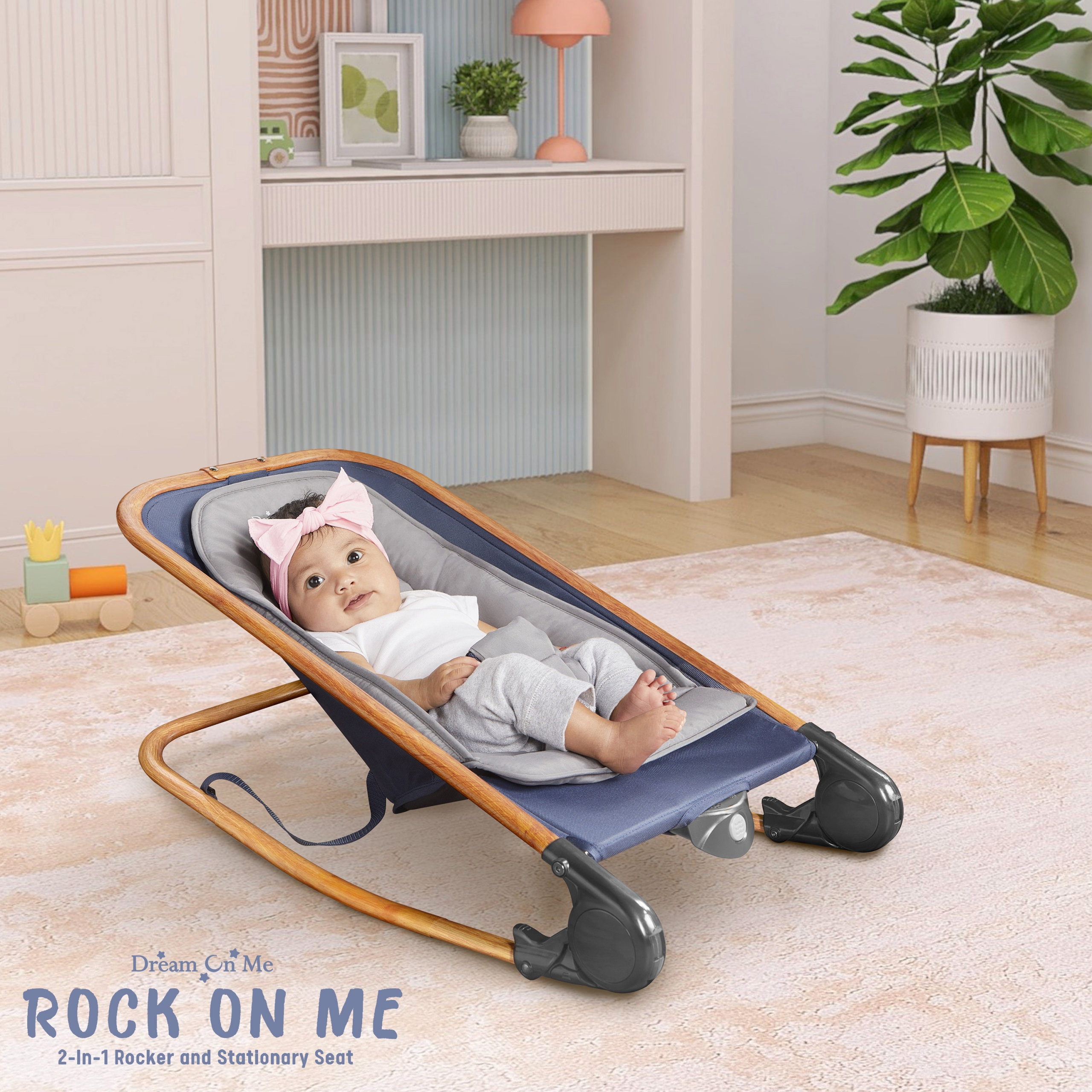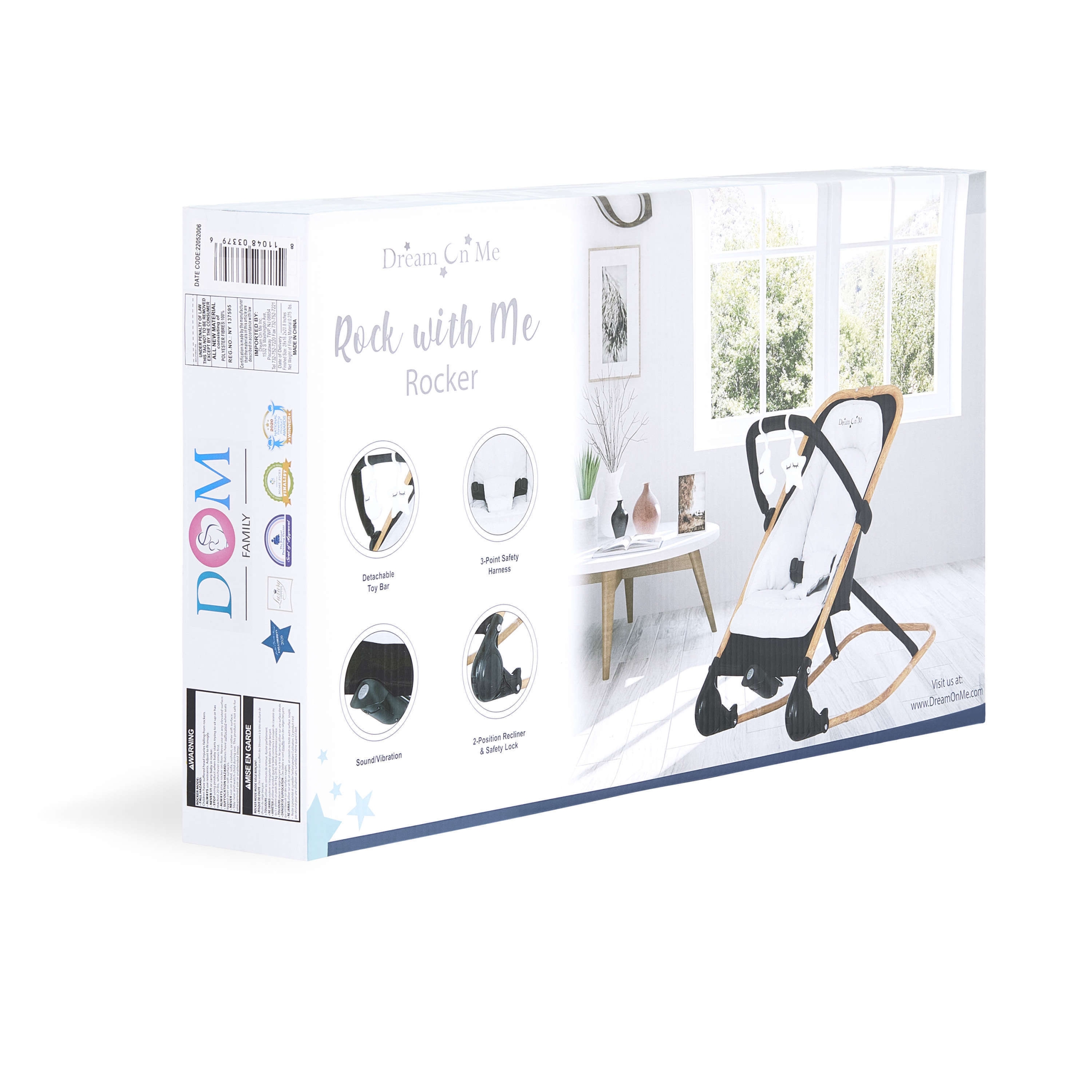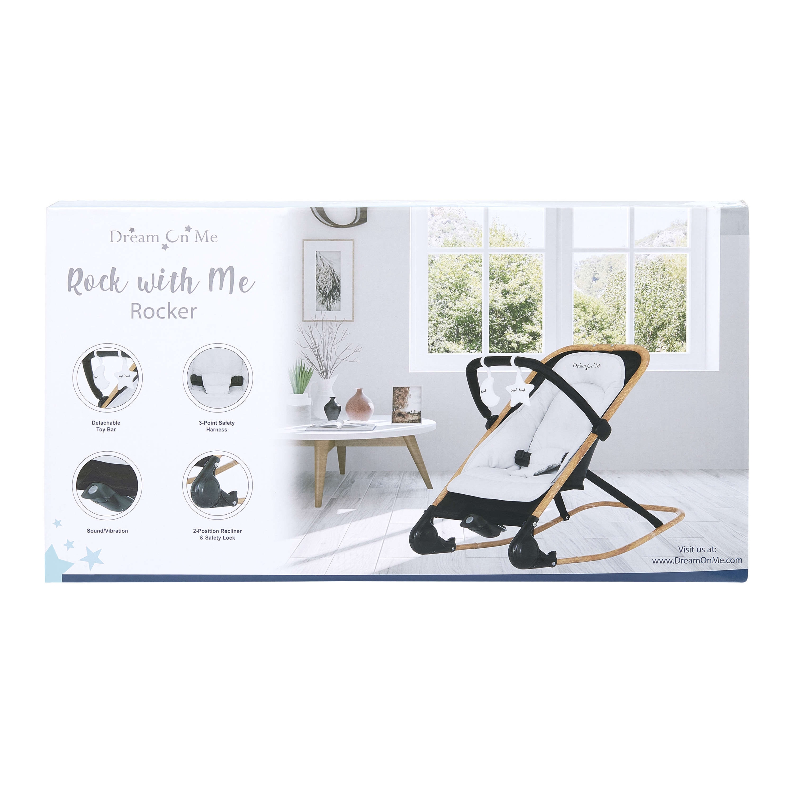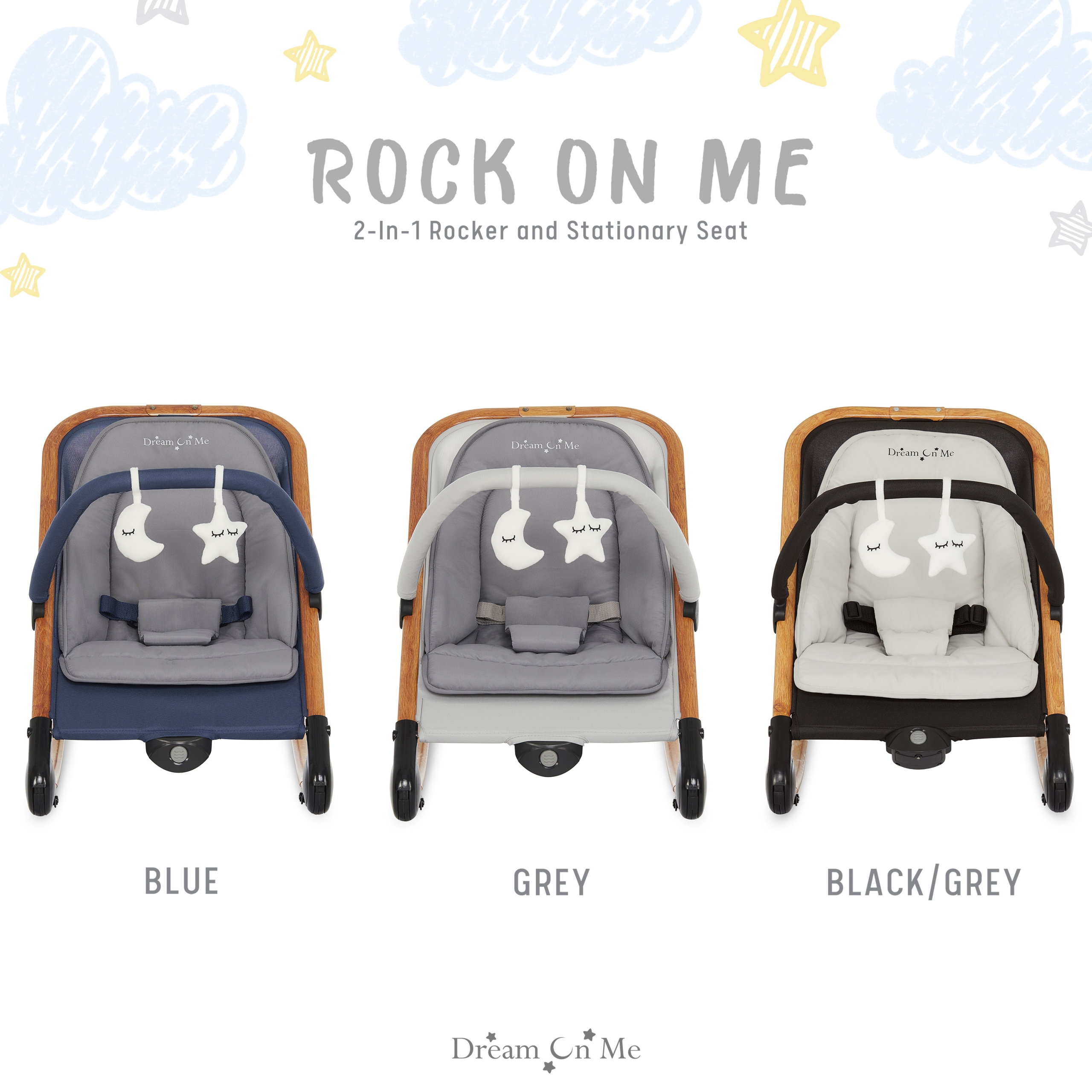 Dream on Me Rock with me 2-in-1 Rocker and Stationary Seat with me is an ideal companion for novice parents. This adorable rocker combines entertainment, functionality and comfort all in one. The perfect companion for comfy times, Rock with me is a comfortable and interactive rocker designed to provide soothing motions, calm, and a multiple position reclining seat for maximum comfort. The gentle music/vibration** units provide a soothing time to the baby. Baby’s weight creates a gentle bouncing motion and vibrations that helps to soothe your little one. You can also add the detachable toy bar to keep them entertained when awake. Soft seat pad and insert with raised borders offers a safe and cozy environment while pillow offers comfort for baby. It’s undoubtedly a nursery must and perfect present for baby showers. Product dimensions are 27.5” L x 15.75” W x 22” H, with a weight of 5.25 Lbs. Available in 3 fun finishes. Never leave your child unattended; always use the restraint system. Do not use the product once your child can sit unaided, climb out or roll over. **AAA batteries required (not included).