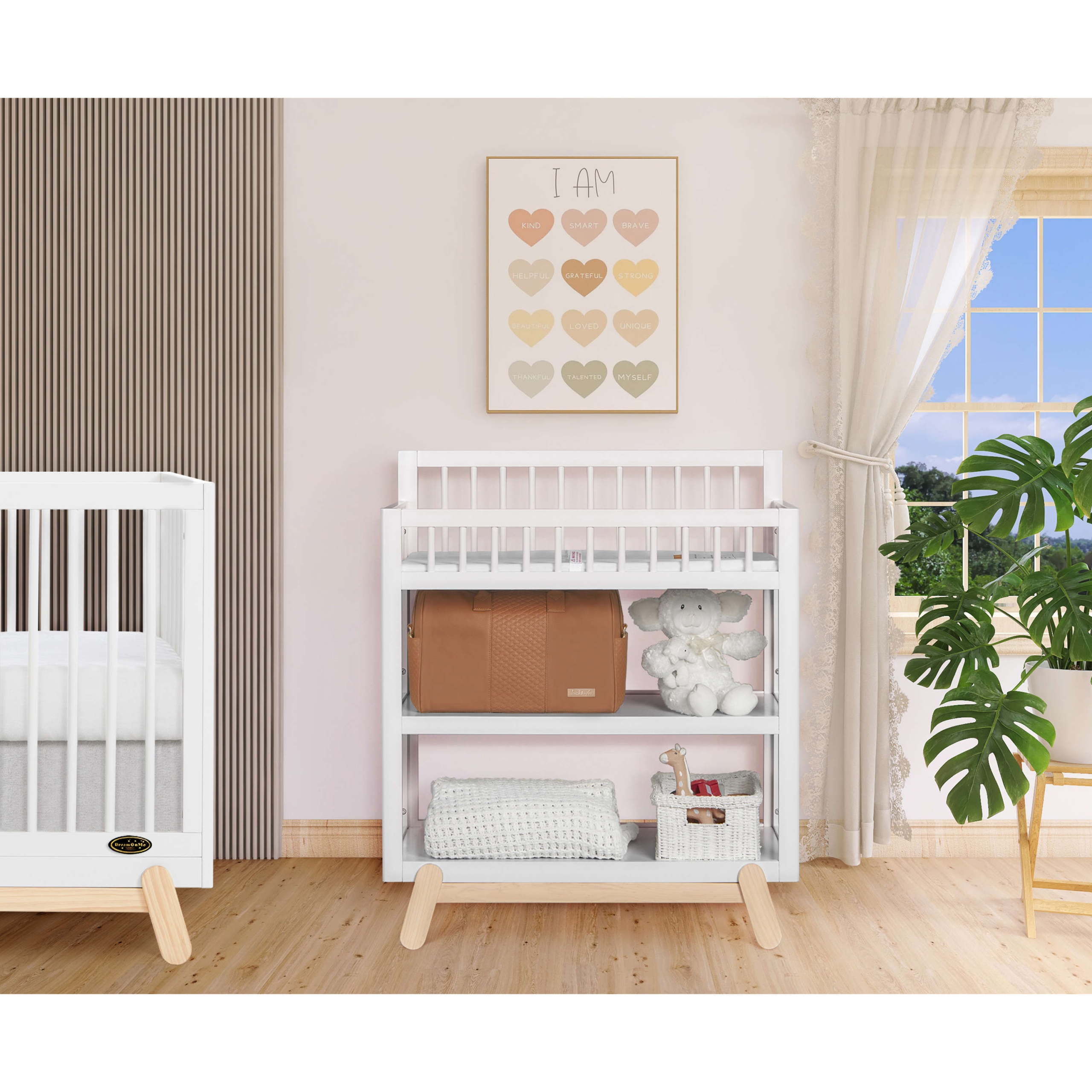 Pamper your baby while you’re on diaper duty with the highly-functional Dream On Me Hygge Changing Table. With a solid, sturdy base and unique Scandinavian-style legs that offer maximum support, this compact changing table is warm & safe for your baby. Designed to fit into your modern nursery, the Dream On Me Hygge Changing Table comes with safety belts and a 1” changing pad. Keeping in mind your child’s safety, as well as your convenience, the Dream On Me Hygge Changing Table is JPMA & Greenguard Gold certified and very easy to clean &maintain. This wonderful addition is thoughtfully crafted, using sustainable New Zealand Pinewood. Not only that, the Dream On Me Hygge Changing Table meets/exceeds the ASTM & CPSC standards and is available in elegant finishes. Product dimensions are 34.5 L x 17.75 W x 41 H. This product comes with a 1-year limited warranty and can be used by children aged 0-6 months.