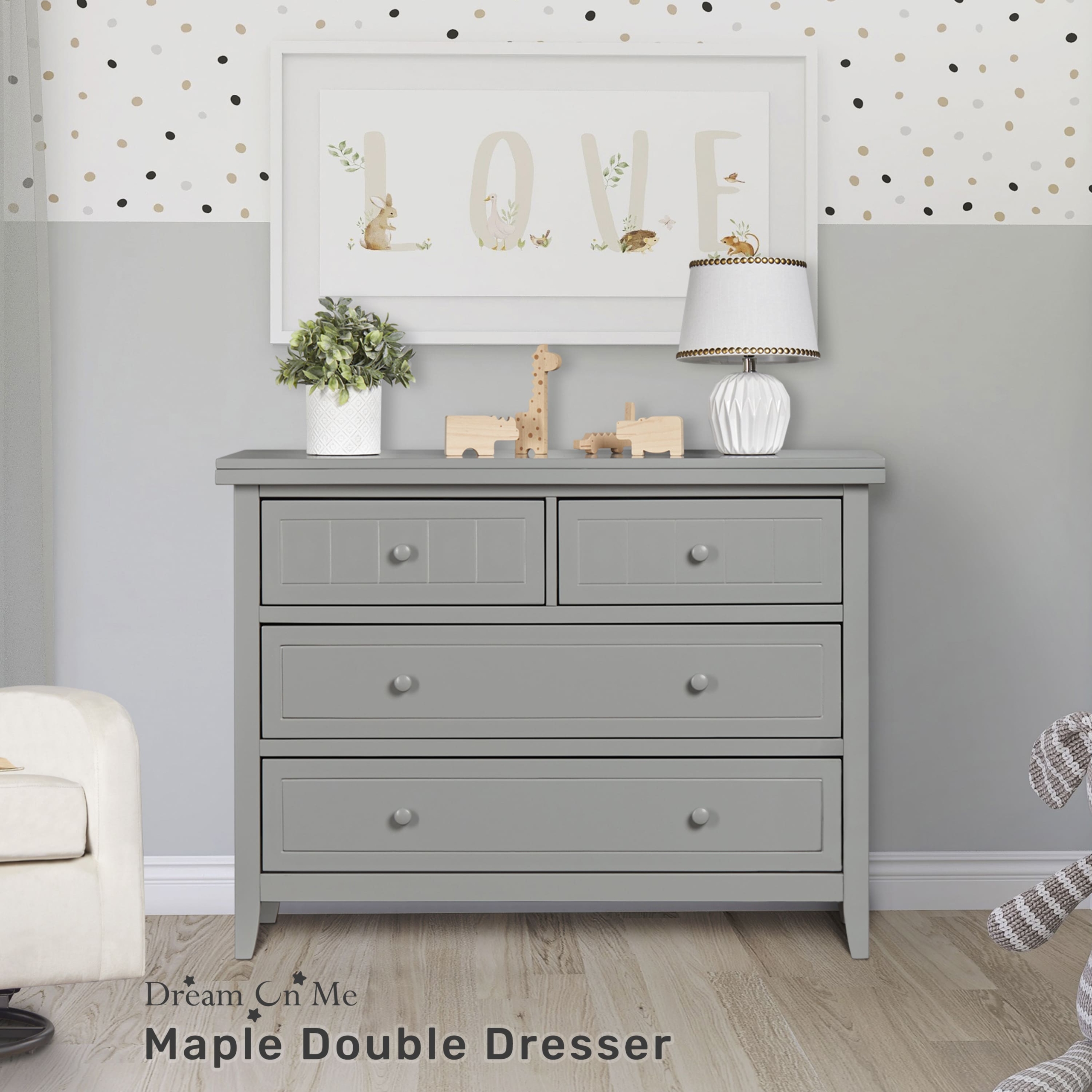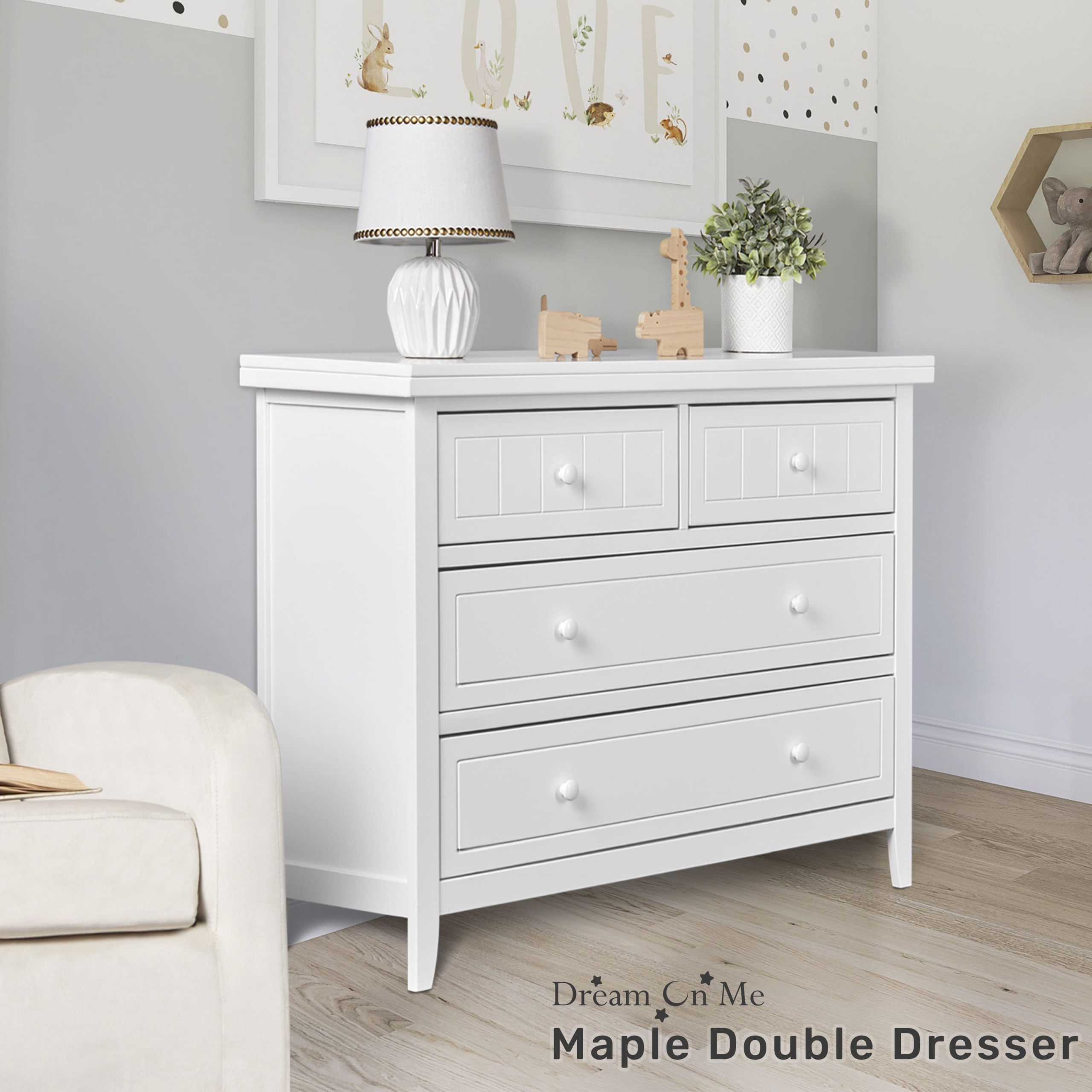Dream On Me Maple Universal 4 Drawers Dresser captures the comfort and relaxing farmhouse elements with its classic framed plank pattern. This dresser is a great addition to your child’s nursery or bedroom. The wooden drawer pulls, clean lines and tapered feet compliment the refreshing finishes, while the four spacious drawers provide room for clothing and accessories. This Dream On Me 4 drawers dresser is crafted from durable solid wood, to work effortlessly throughout the years. This Dresser offers a little rustic charm to an ageless nursery.