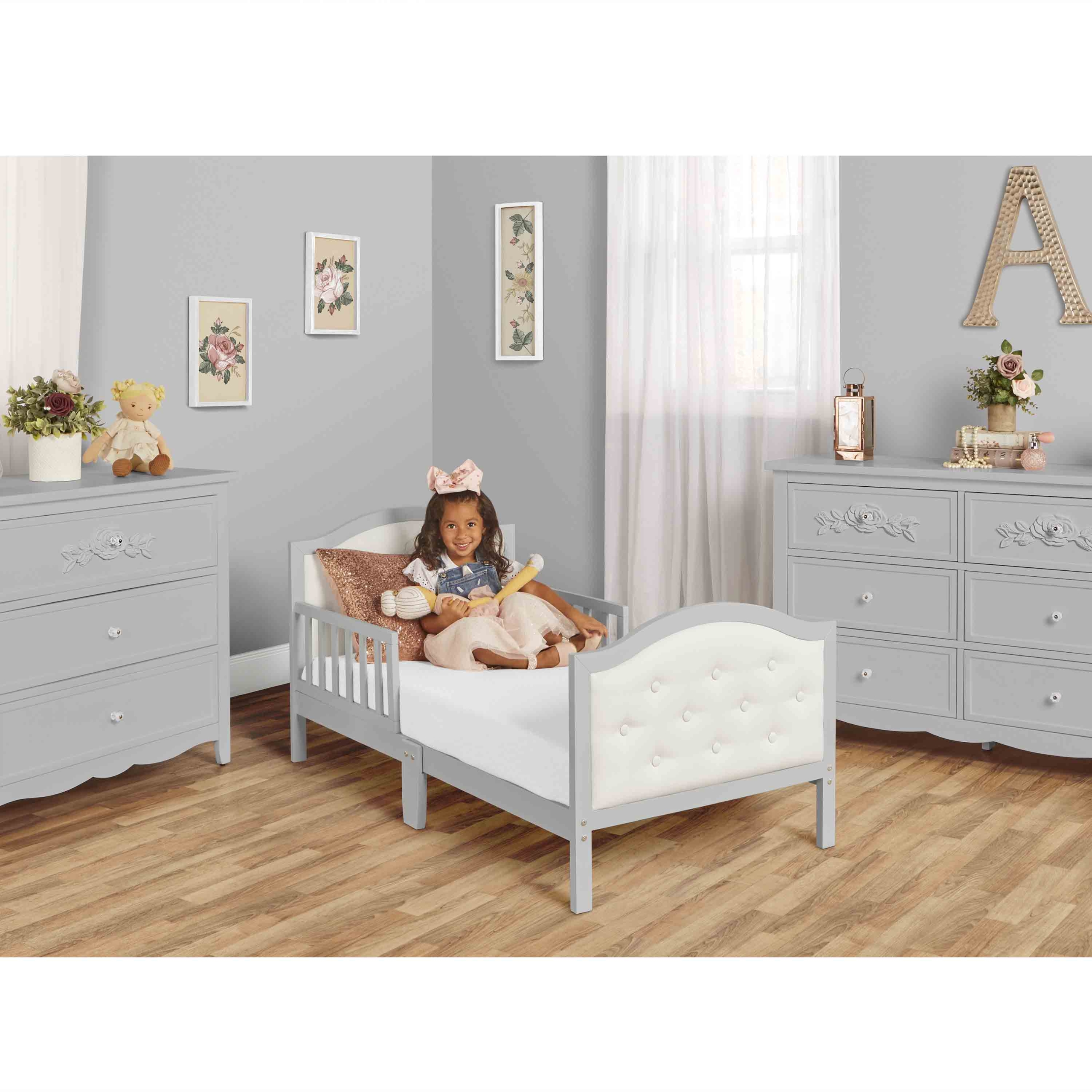 Meet the perfect addition to your little one’s big boy/big girl room! The affordable & high-quality Dream On Me Zinnia Toddler Bed is designed to welcome your growing child into their new milestone with a sturdy design & aesthetic. Made of strong, solid wood, it seamlessly blends into any décor style with non-toxic faux leather on the footboard and headboard! Comfort & safety are synonymous in our world, ensuring that the Zinnia Toddler Bed is JPMA certified and meets or exceeds all applicable ASTM & CPSC standards. What’s more, it comes in refreshing finish – to give your toddler’s bedroom that extra spunk of color! The minimum age of the child shall be no less than 15 months, and maximum weight up to 50 lbs (22.7 Kgs).