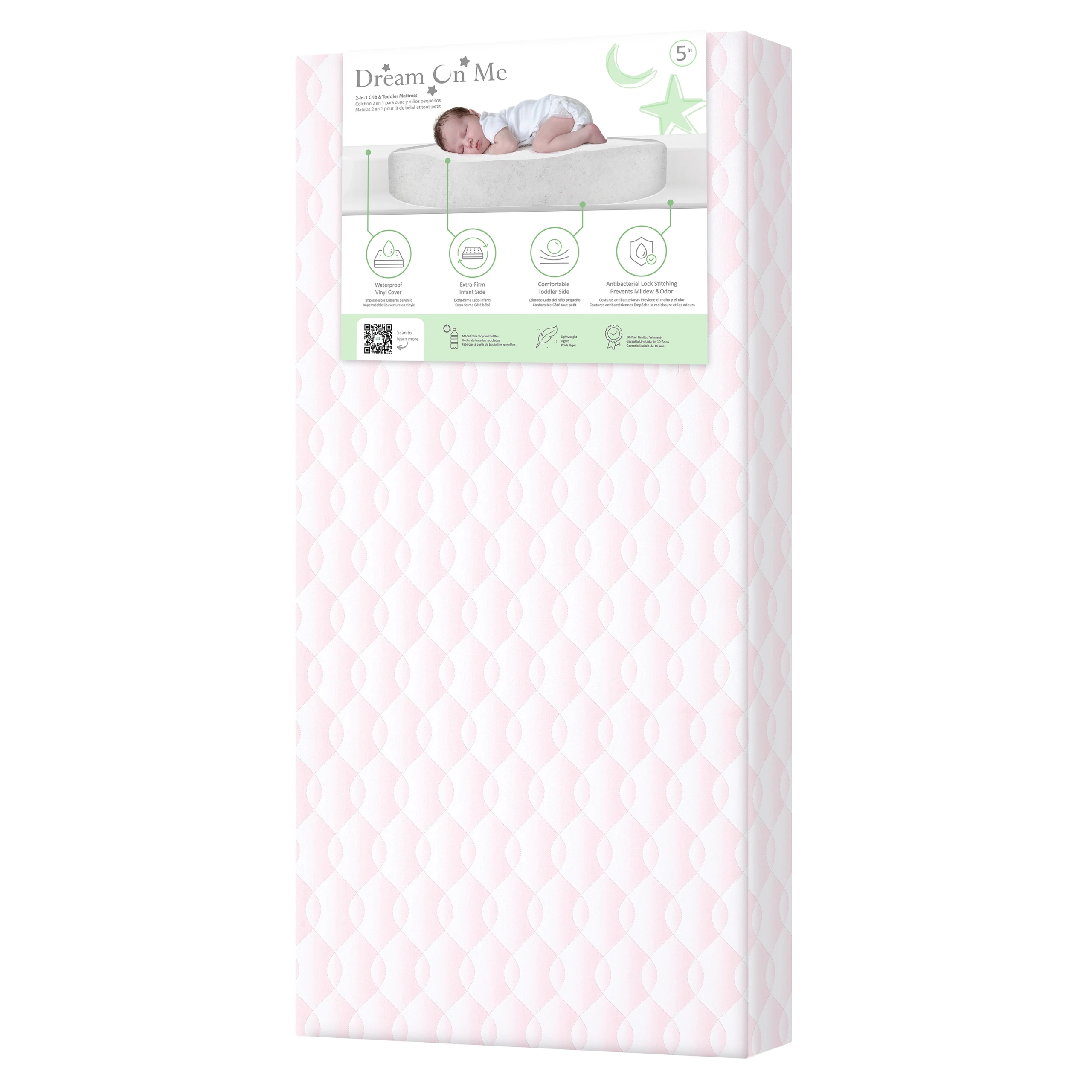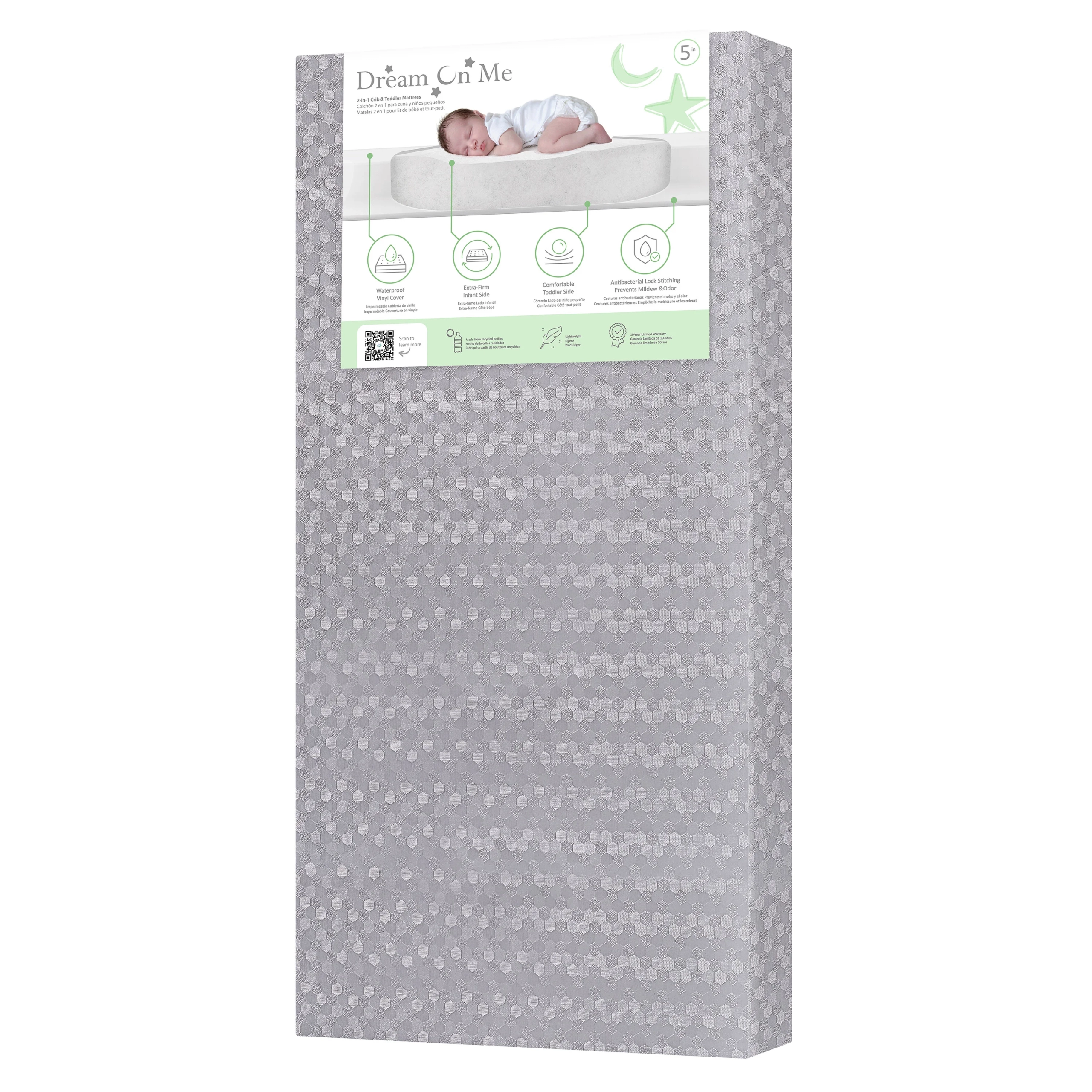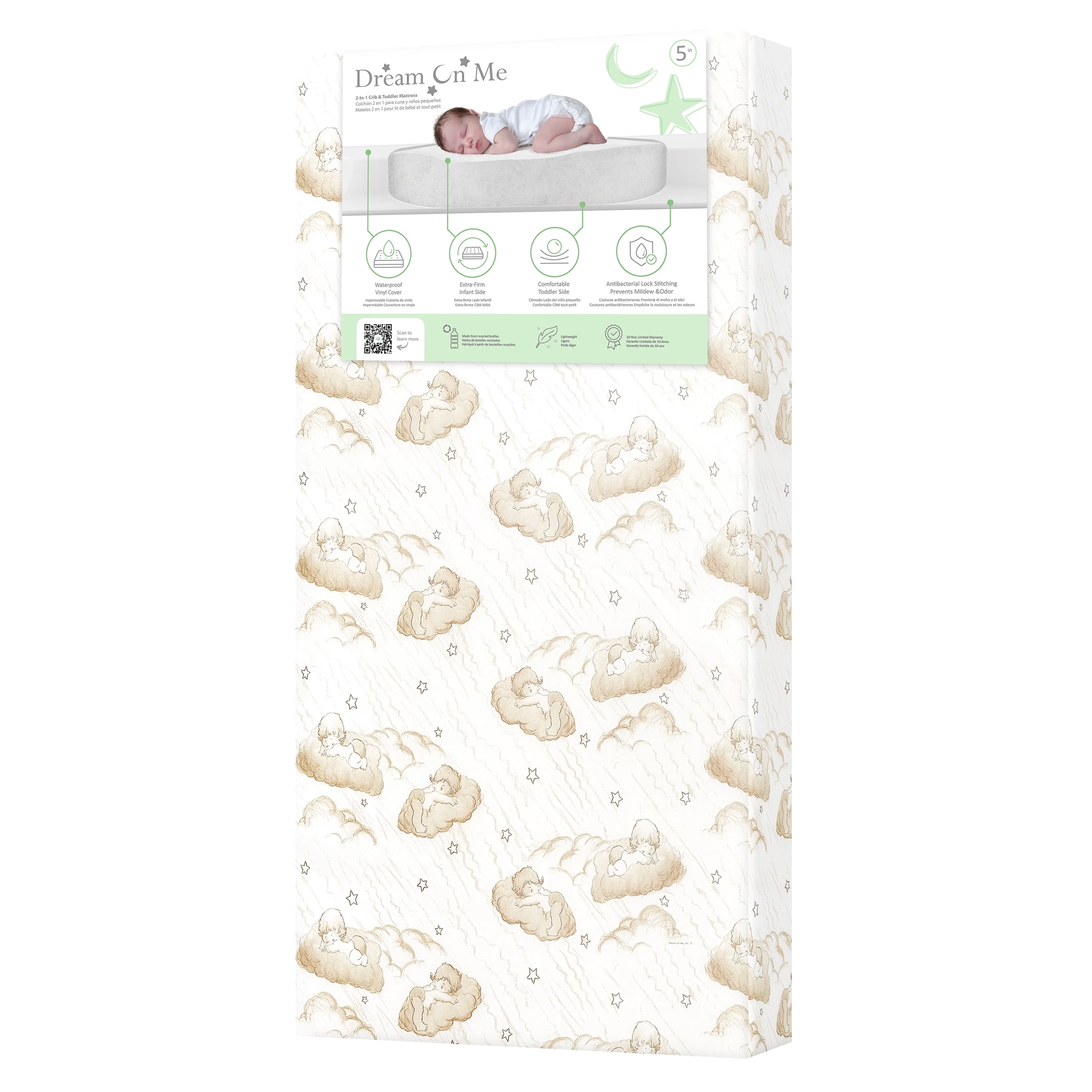 The Dream On Me 2 in 1 Little Lullaby Crib and Toddler Mattress offers the perfect blend of safety, comfort, and eco-conscious design with a dual-sided surface—firm for infants and soft for toddlers—wrapped in a waterproof vinyl cover that’s easy to clean. It’s made from 5 inches of fiber containing 75% recycled materials and features anti-bacterial lock stitching for added protection. This mattress meets the highest safety standards, including Greenguard Gold and BSA certifications. Lightweight and durable, it comes with a 5-year limited warranty for your peace of mind.