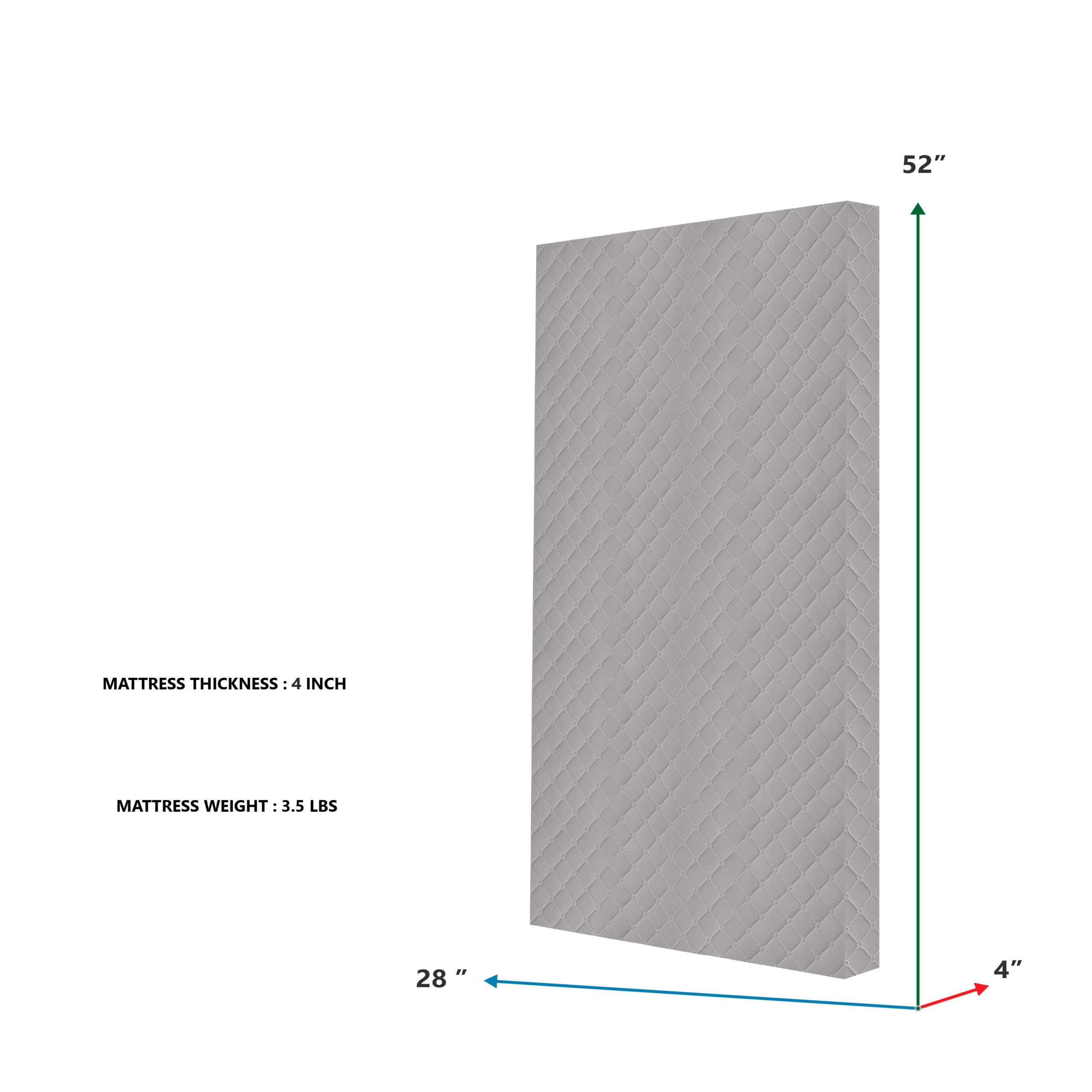 PRODUCT SPECS: The mattress dimensions are 51.75” L X 27.5” W X 4” H and it weighs 3.5 Lbs. Fits standard full-size cribs and toddler beds.