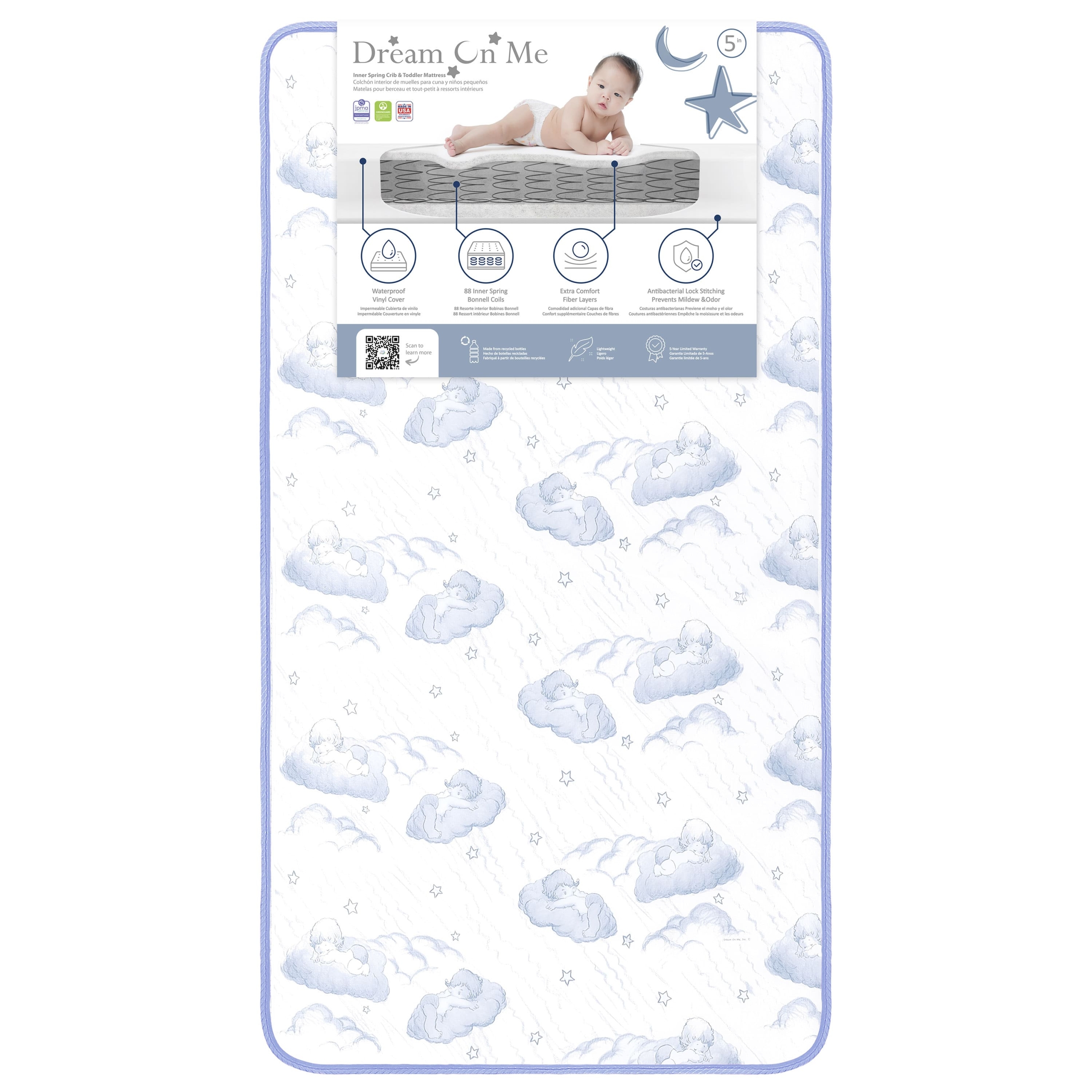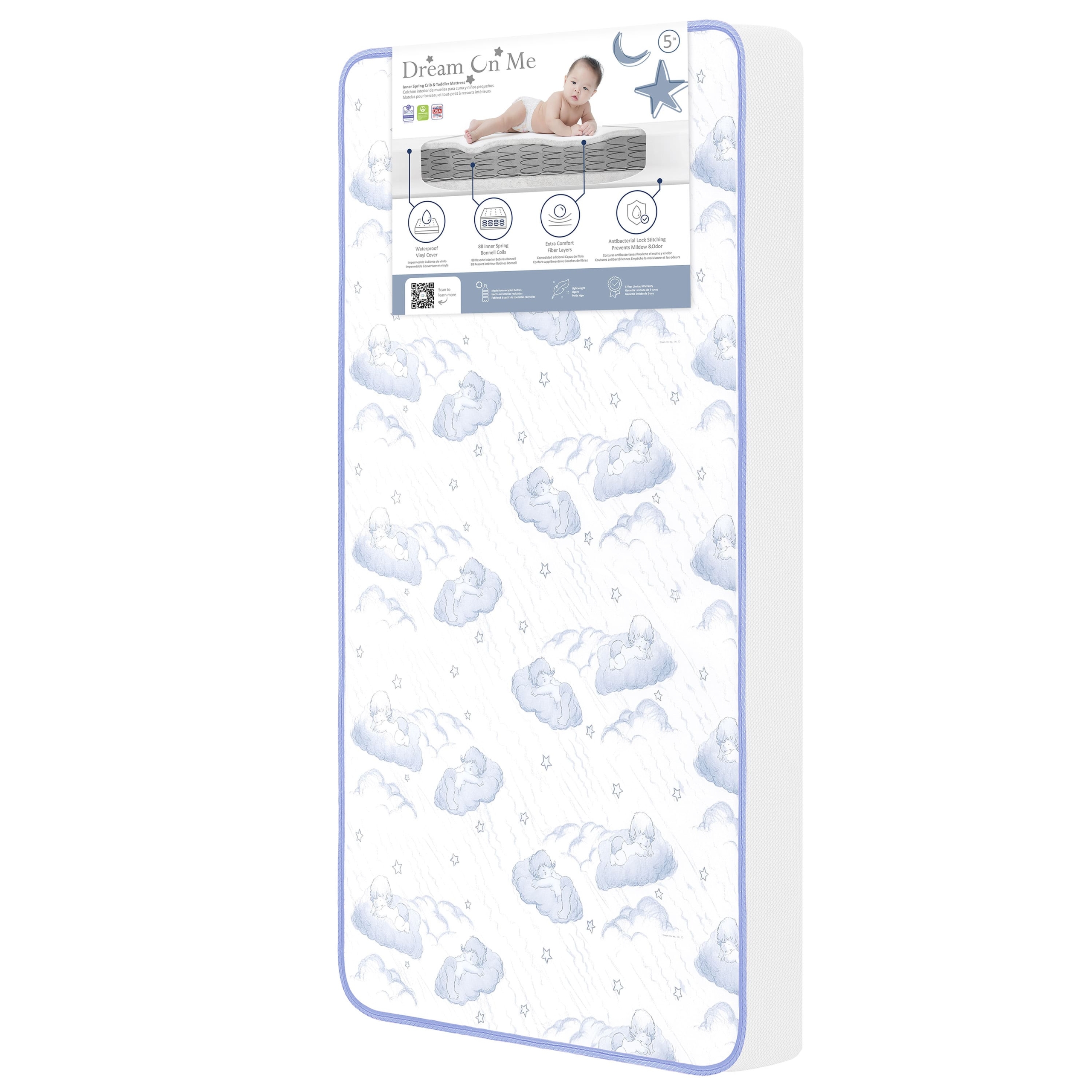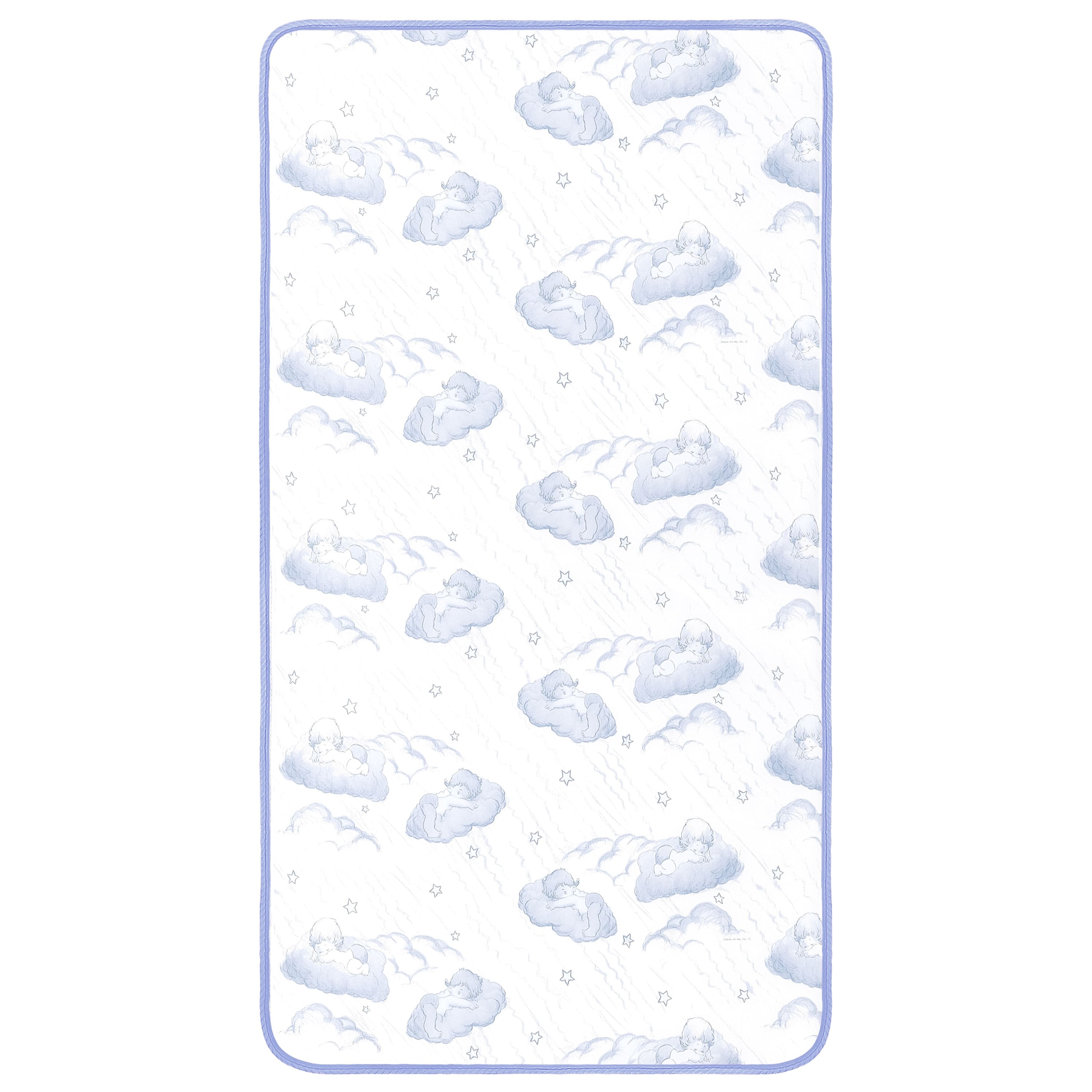 Comfort, breathability and support guaranteed for peaceful nights of rest! The Dream On Me 2-in-1 Breathable Sweet Dreams 88 Coil Spring Crib and Toddler Bed Mattress is a must in every nursery. It is the perfect blend of support and comfort with 88 interwoven, heat tempered, steel coils plus a CertiPUR-US certified layer for added comfort. The reversible design allows it to keep pace with your growing child: a white infant side with breathe-flow material and a toddler side with a waterproof cover featuring a blue and white cloud print with lock stitch seams. The Dream On Me 2-in-1 Breathable Crib and Toddler Bed Mattress fits standard full-size cribs and toddler beds. Know your bub will breathe easy thanks to the unique breathe-flow technology that promotes airflow. Liquids and stains are kept out thanks to the reinforced waterproof cover and binding. To clean, wipe with mild soap and warm water. The Mattress is Greenguard Gold certified and meets/exceeds all flammability (16 CFR 1632/1633), phthalate and lead tests. It is designed, engineered, and proudly made in the USA and comes with a 30-day warranty. Product dimensions are 52” L X 28” W X 5” H and it weighs 17 Lbs.