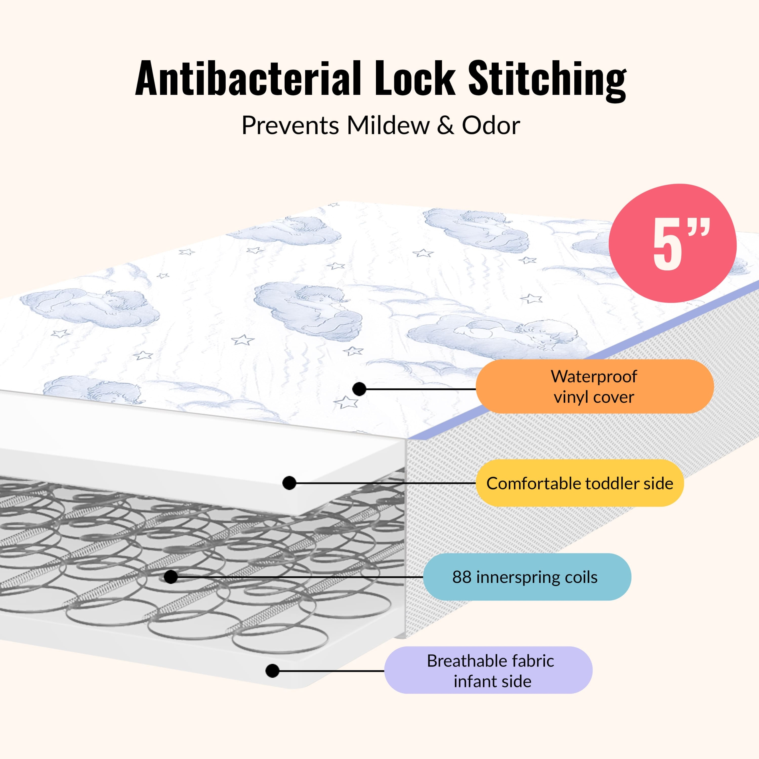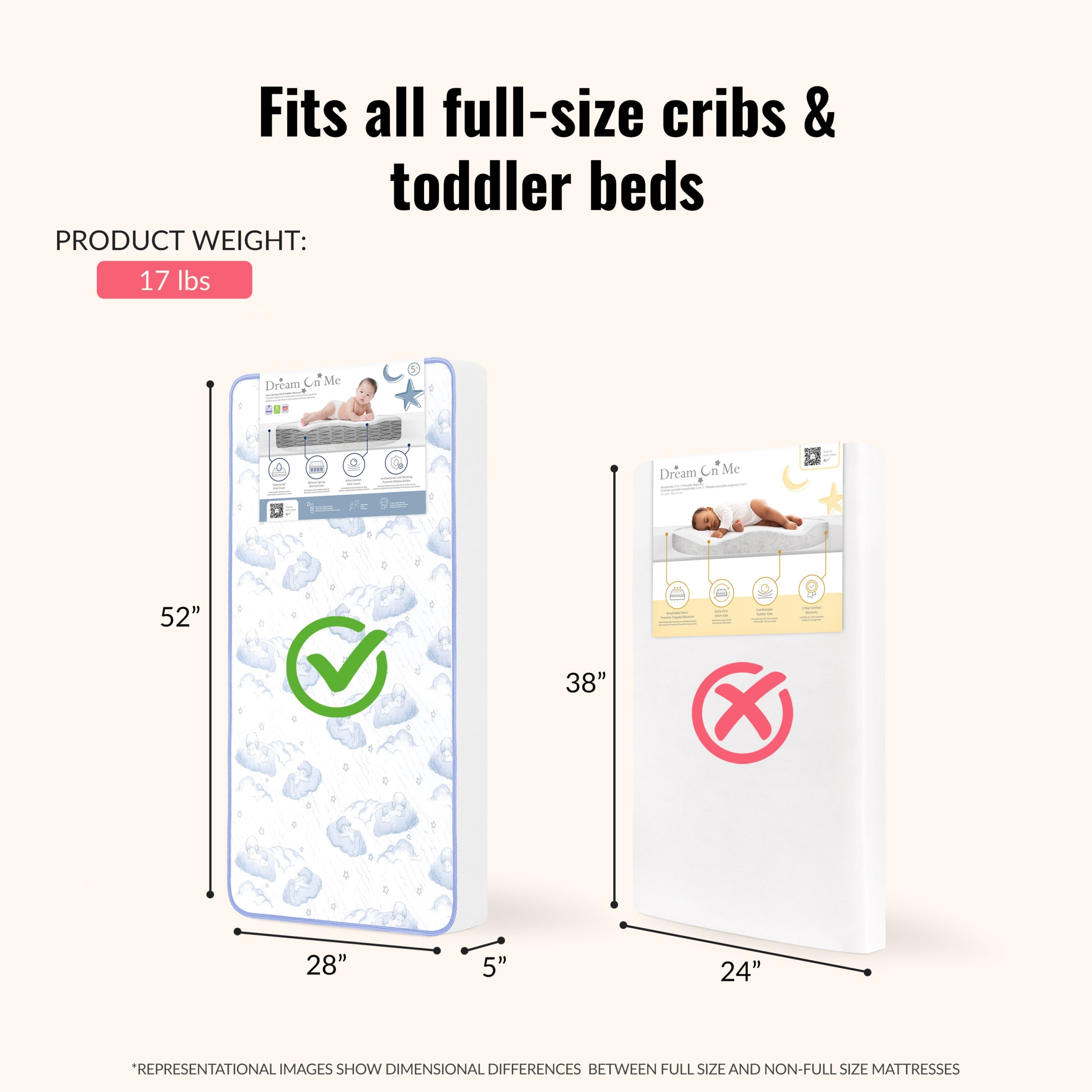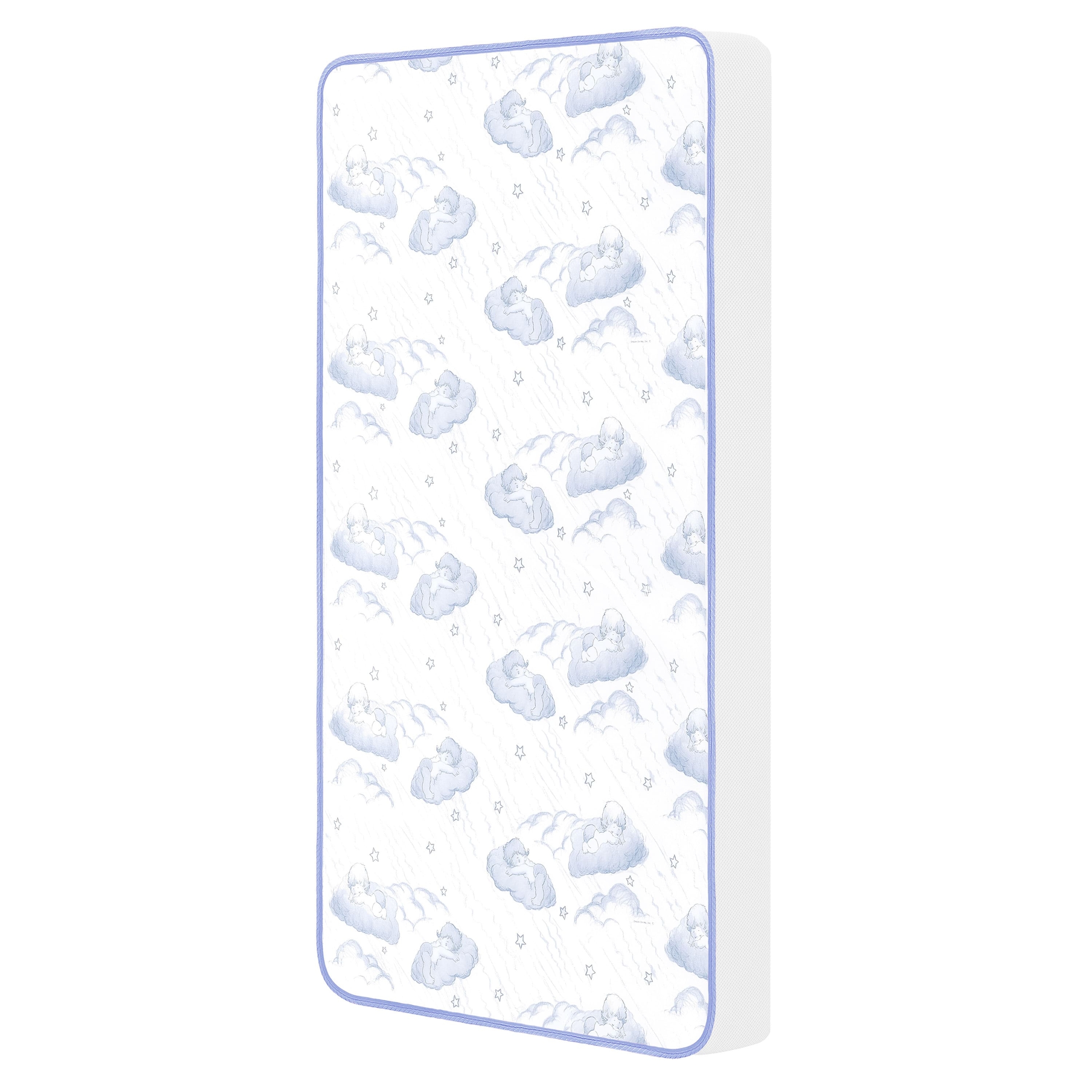 Comfort, breathability and support guaranteed for peaceful nights of rest! The Dream On Me 2-in-1 Breathable Sweet Dreams 88 Coil Spring Crib and Toddler Bed Mattress is a must in every nursery. It is the perfect blend of support and comfort with 88 interwoven, heat tempered, steel coils plus a CertiPUR-US certified layer for added comfort. The reversible design allows it to keep pace with your growing child: a white infant side with breathe-flow material and a toddler side with a waterproof cover featuring a blue and white cloud print with lock stitch seams. The Dream On Me 2-in-1 Breathable Crib and Toddler Bed Mattress fits standard full-size cribs and toddler beds. Know your bub will breathe easy thanks to the unique breathe-flow technology that promotes airflow. Liquids and stains are kept out thanks to the reinforced waterproof cover and binding. To clean, wipe with mild soap and warm water. The Mattress is Greenguard Gold certified and meets/exceeds all flammability (16 CFR 1632/1633), phthalate and lead tests. It is designed, engineered, and proudly made in the USA and comes with a 30-day warranty. Product dimensions are 52” L X 28” W X 5” H and it weighs 17 Lbs.