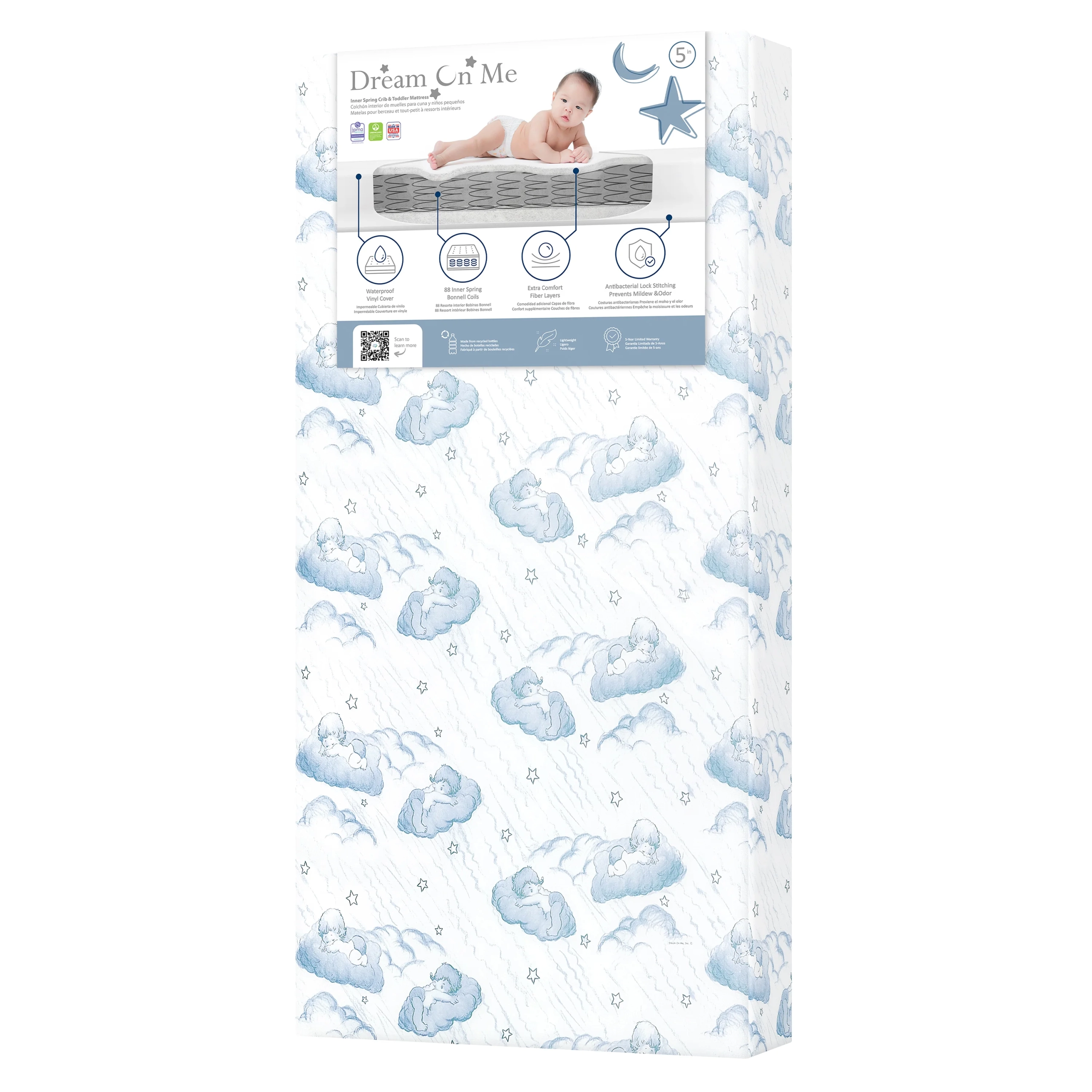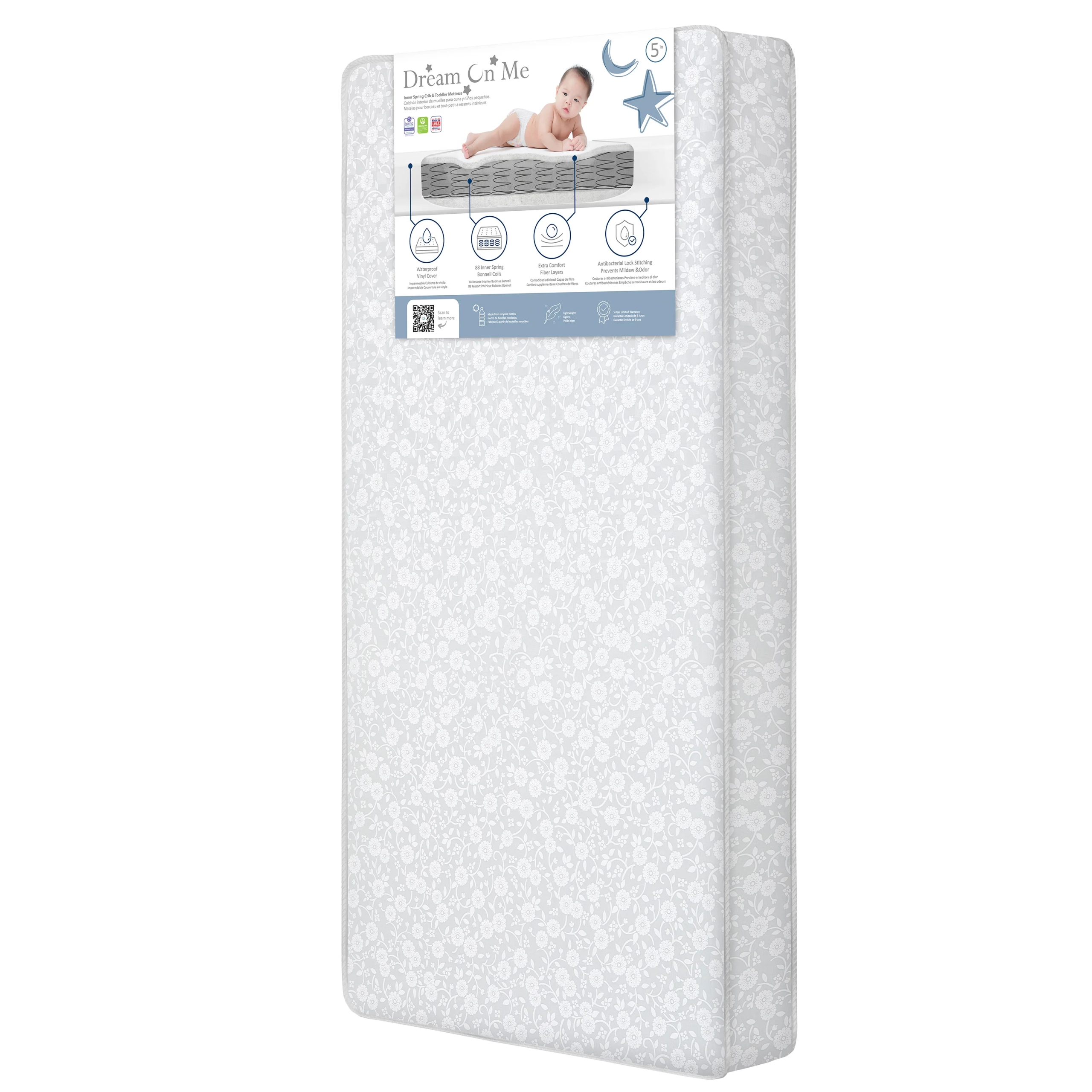 Support, safety, and style come together in the Dream On Me Nap Nest Crib and Toddler Mattress. Designed with 88 interwoven coils and plush fiber layers on both sides, it provides firm, balanced support for your growing child. The waterproof vinyl cover ensures messes are no problem, while anti-bacterial lock stitching helps maintain a hygienic sleep surface. Made with eco-friendly materials and certified for the highest safety standards, the Nap Nest is a smart, reliable choice—wrapped in cheerful designs to brighten any nursery.