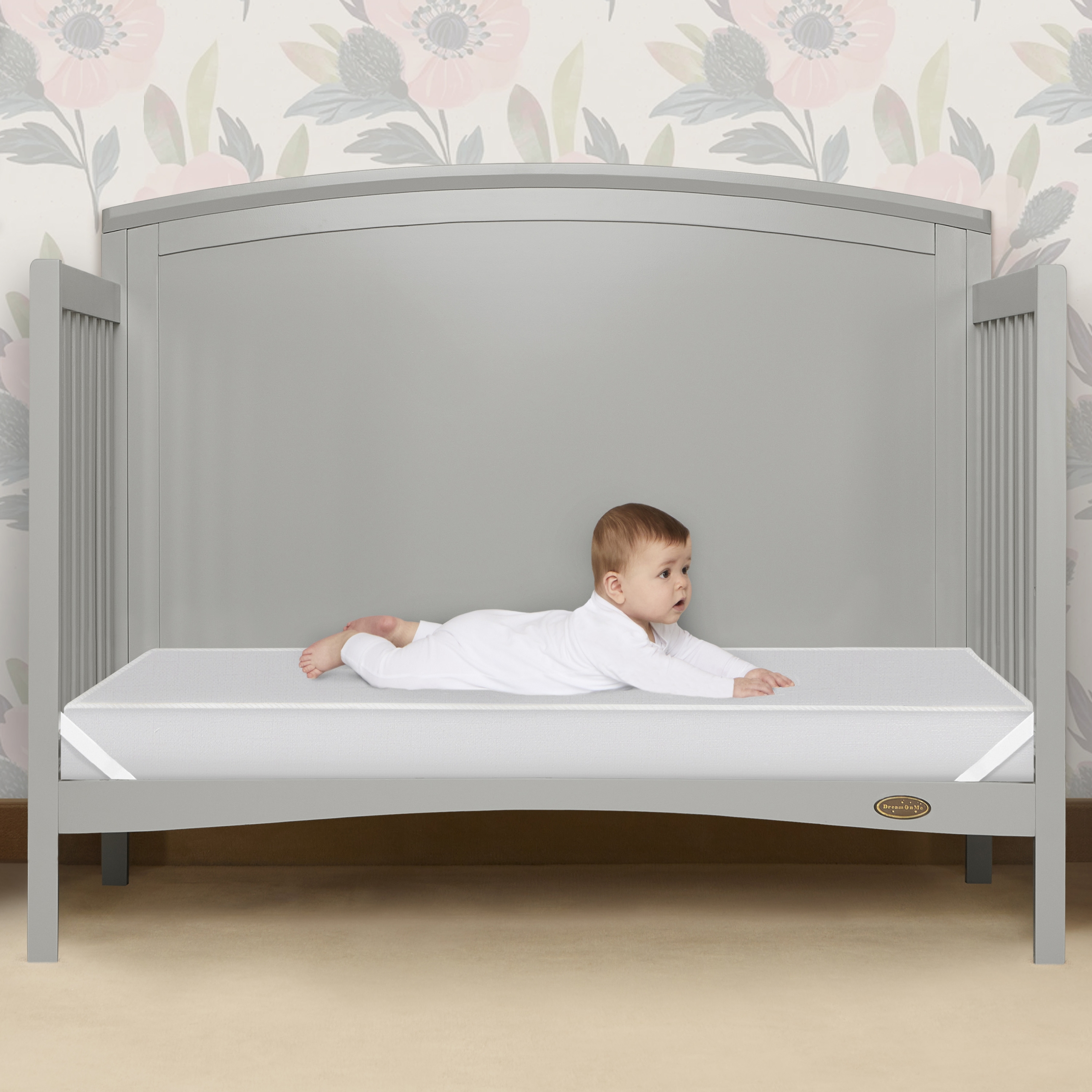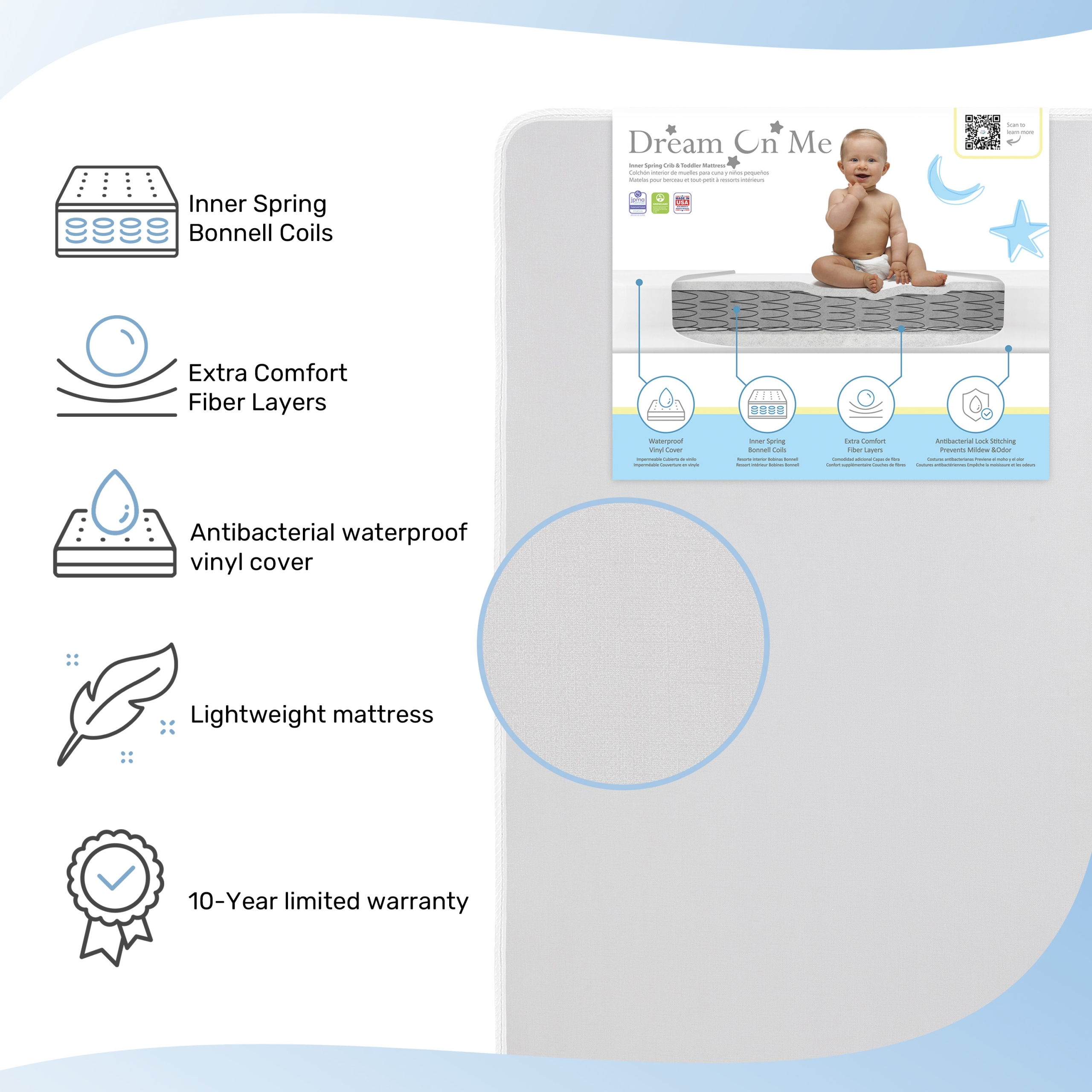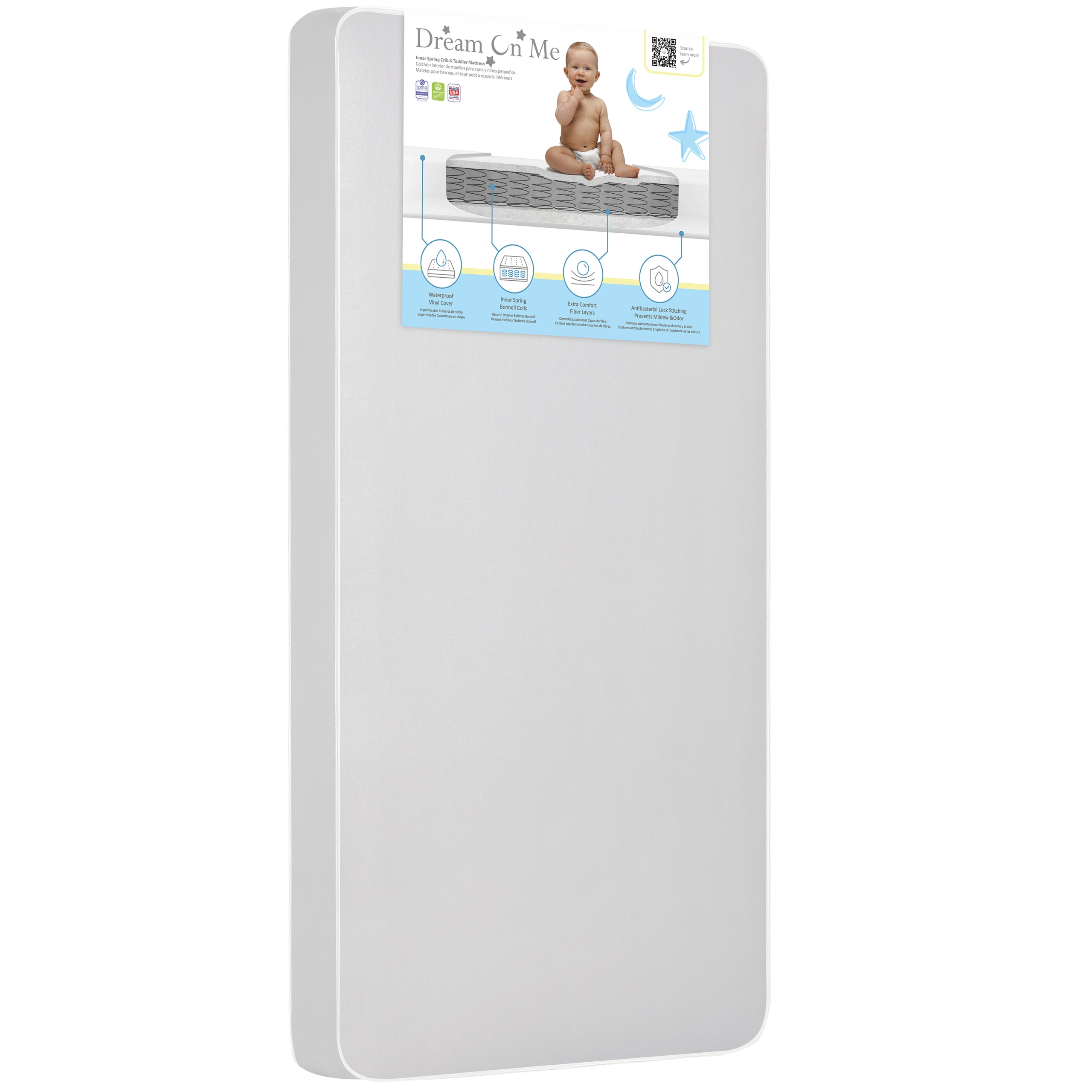 The Dream On Me Nirvana 6” 96 Coil Inner Spring Crib And Toddler Mattress is all about unparalleled safety, comfort and durability. Made in the USA, this mattress is Greenguard Gold certified and meets/exceeds all flammability (16 CFR 1632/1633), phthalate, lead & toxicity tests. It is constructed with a layer of fire blocker and comes with a 10-year manufacturer warranty. The Dream On Me Nirvana 6” 96 Coil Inner Spring Crib And Toddler Mattress creates a firm sleeping foundation for your child courtesy a core of 96 interwoven, heat tempered, spring steel coils. Comfort is assured with the protective polyurethane foam wrap on either side. The reinforced waterproof cover locks out moisture and stains while the metal-free airflow pockets ensure freshness. To clean, simply wipe with soap and water. Durable features like a fiber insulating layer and lockstitch waterproof binding make the Dream On Me Nirvana 6” 96 Coil Inner Spring Crib And Toddler Mattress a long-term investment, suitable for both standard size cribs and toddler beds.