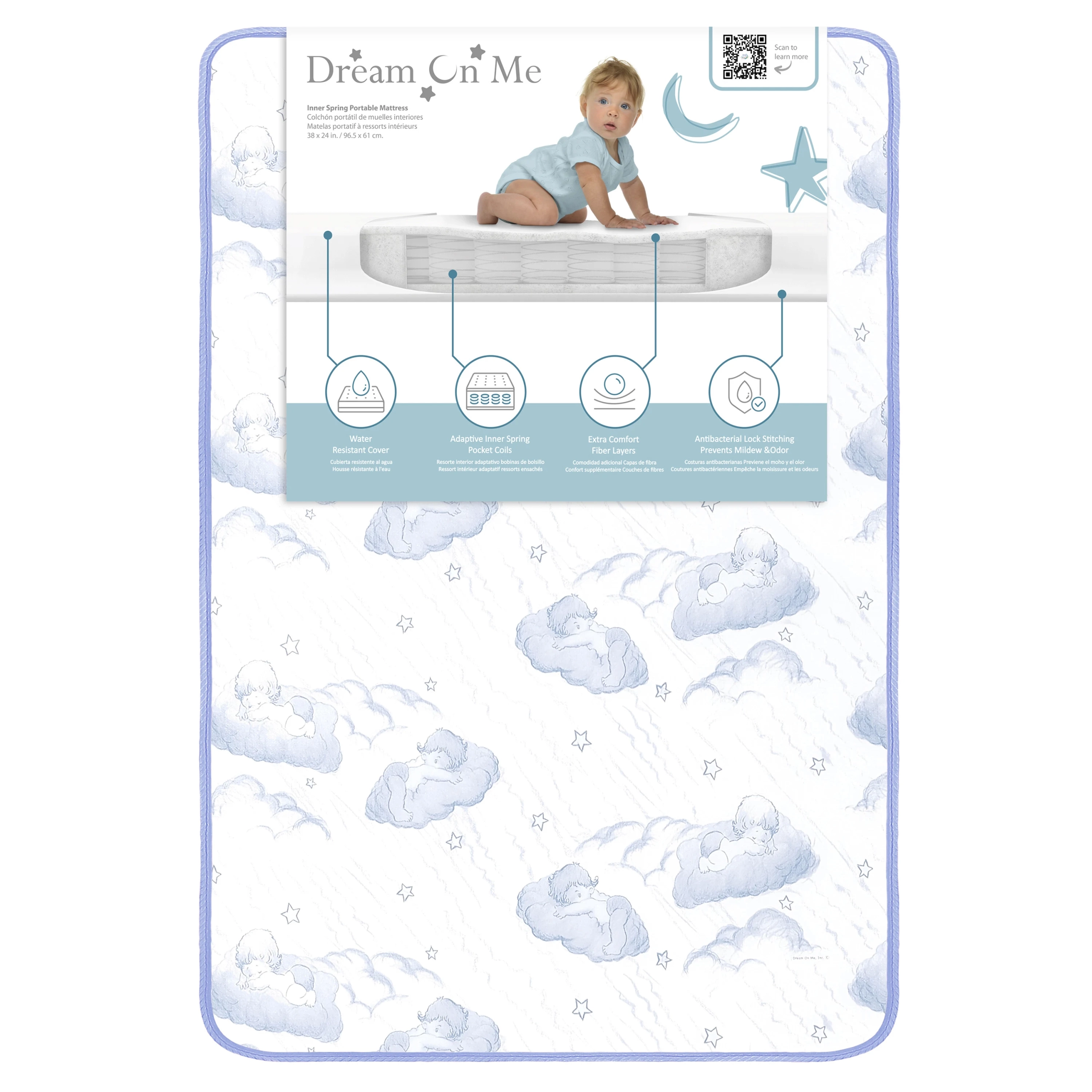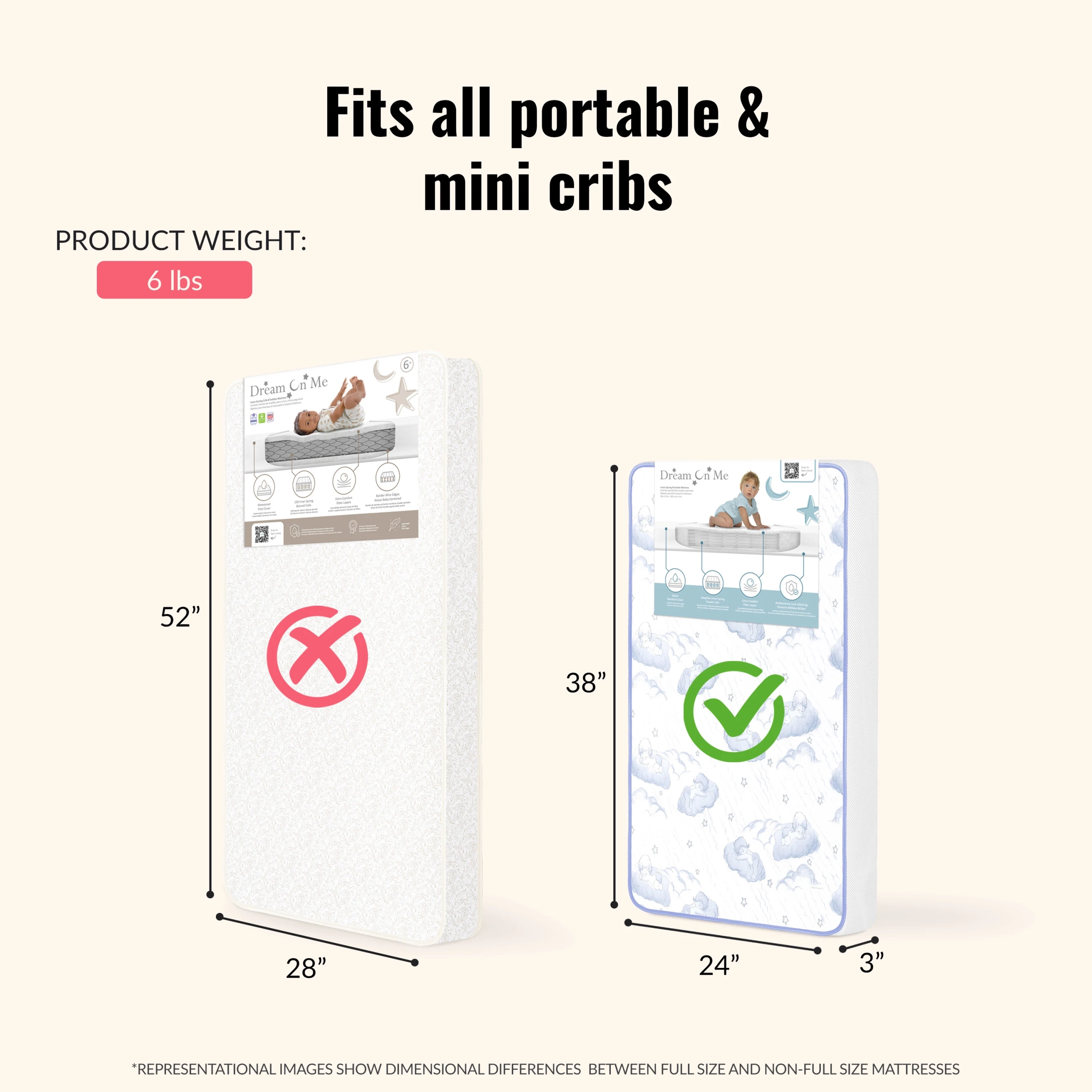 Dream On Me, 2-In-1 Breathable 3″ Spring Coil Portable Crib Mattress offers supreme comfort and quality. Our mattress is designed to fit portable and Mini cribs it features interwoven steel coil that’s wrapped in CertiPUR-US certified layer for comfort these mattress are covered with a breathe – flow material on the infant side and a waterproof cover on the toddler side with lock stitch seams. Dream On Me mattress meets the Federal Flammability Standard.