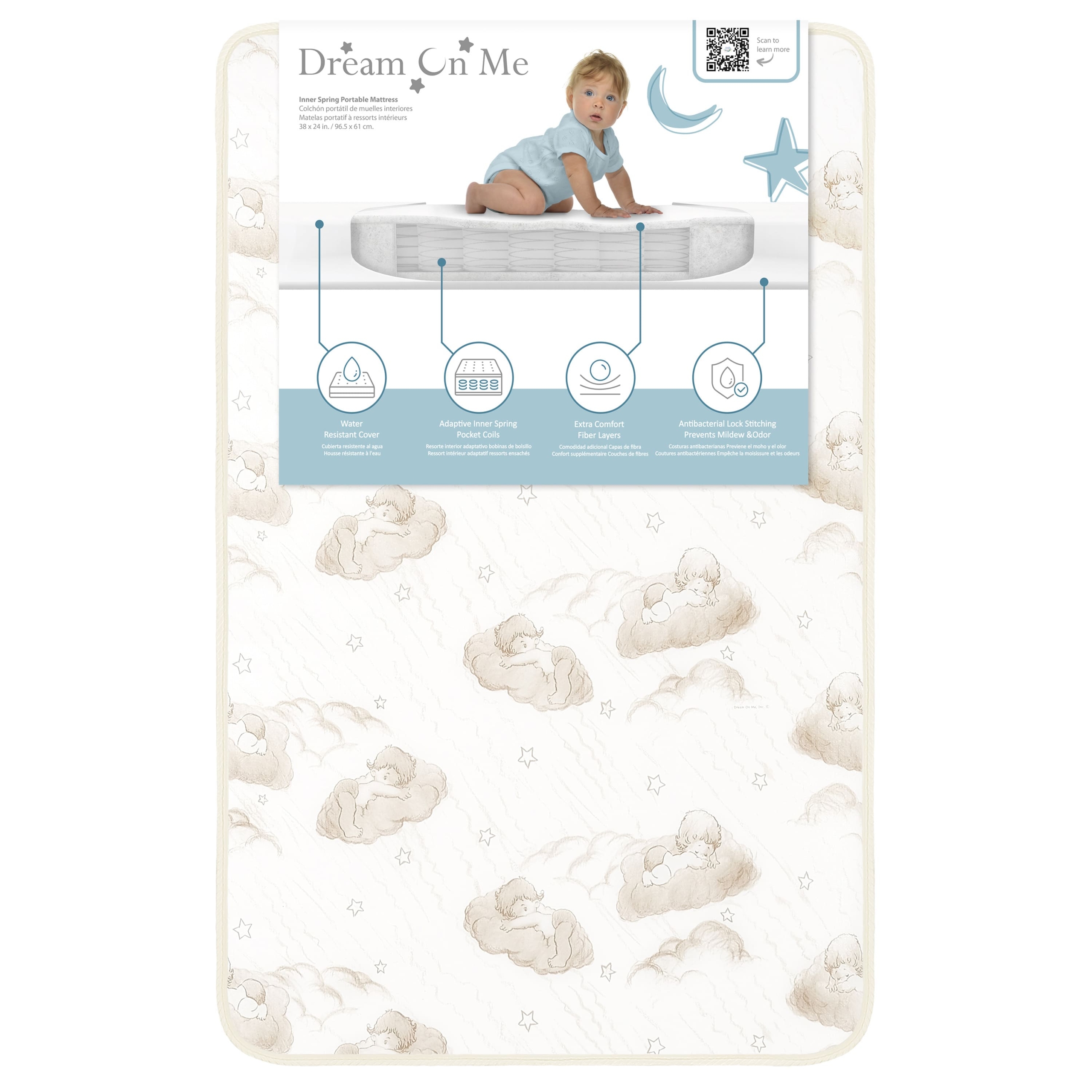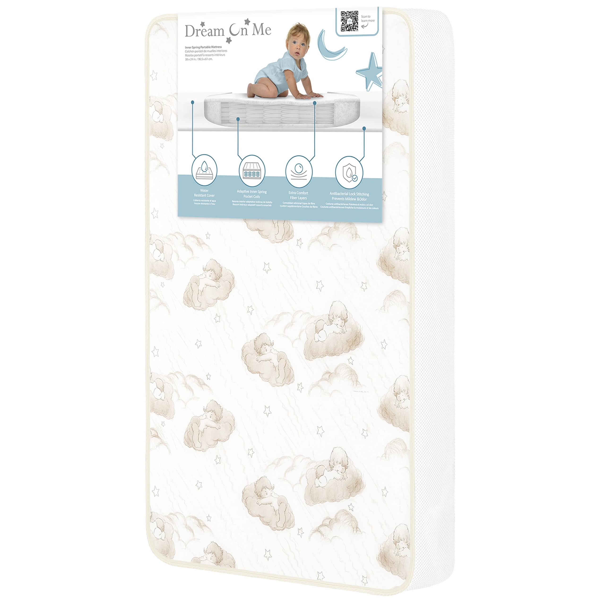 The Dream On Me 2-in-1 Breathable Two-Sided 3″ Portable Crib Mattress is a must-have nursery accessory in smaller homes and apartments. Designed to fit portable/mini cribs, this made-in-the-USA mattress is Greenguard Gold certified and meets/exceeds all flammability (16 CFR 1632/1633) standards. The Dream On Me 2-In-1 Breathable Two-Sided 3″ Portable Crib Mattress comes with a firm core of 3” interwoven steel coils that are wrapped in a CertiPUR-US certified layer, offering the perfect blend of support and comfort. It features a reversible design: an infant side covered with breath flow material and a toddler side with a waterproof cover and lockstitch binding that keeps out liquids and stains, creating hygienic & safe sleeping conditions. The Dream On Me 2-In-1 Breathable Two-Sided 3″ Portable Crib Mattress weighs 8 Lbs.