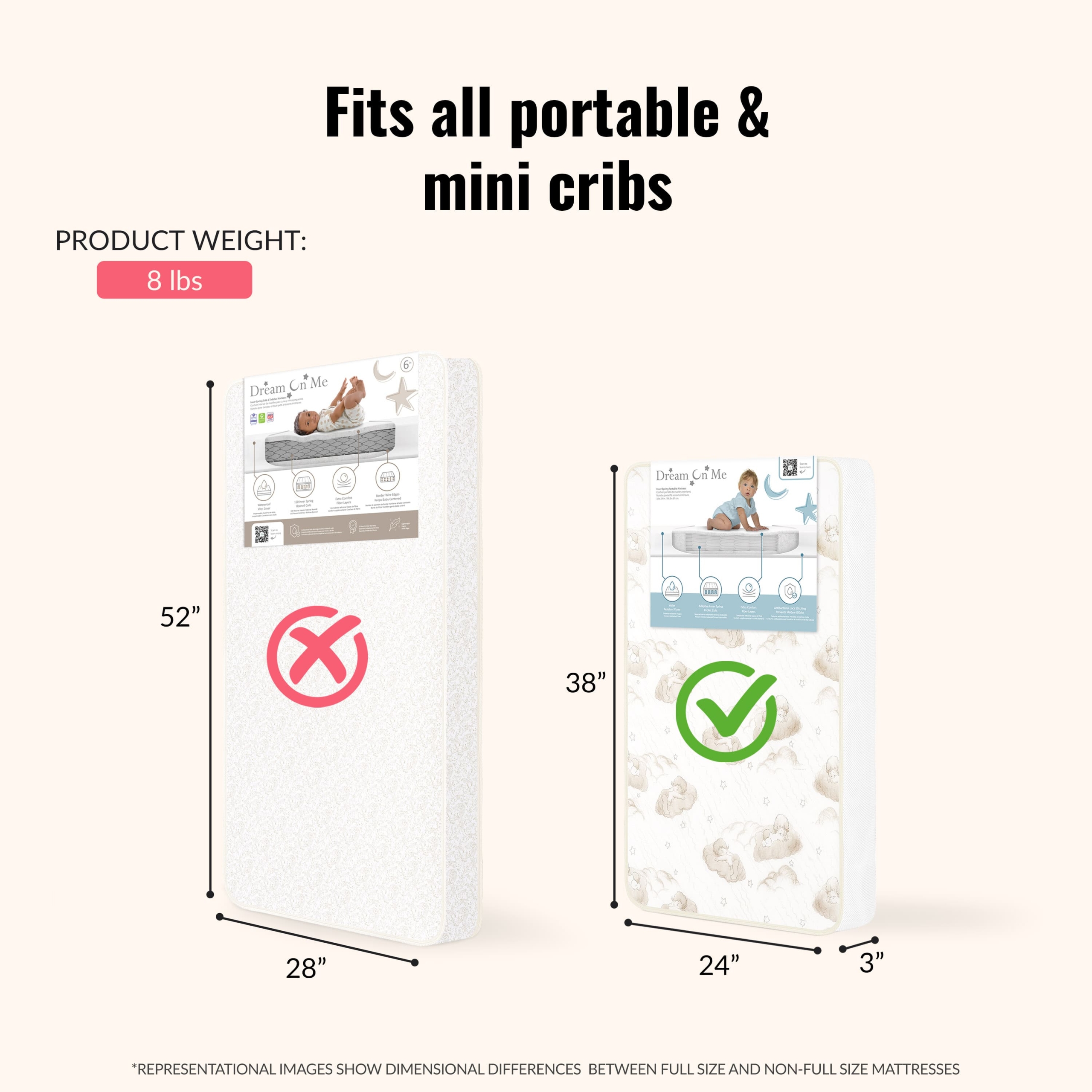 • PRODUCT SPECS: The mattress dimensions are 38” L X 24” W X 3” H and it weighs 8 Lbs. Designed to fit Portable/Mini Cribs (not recommended for use with Playards).