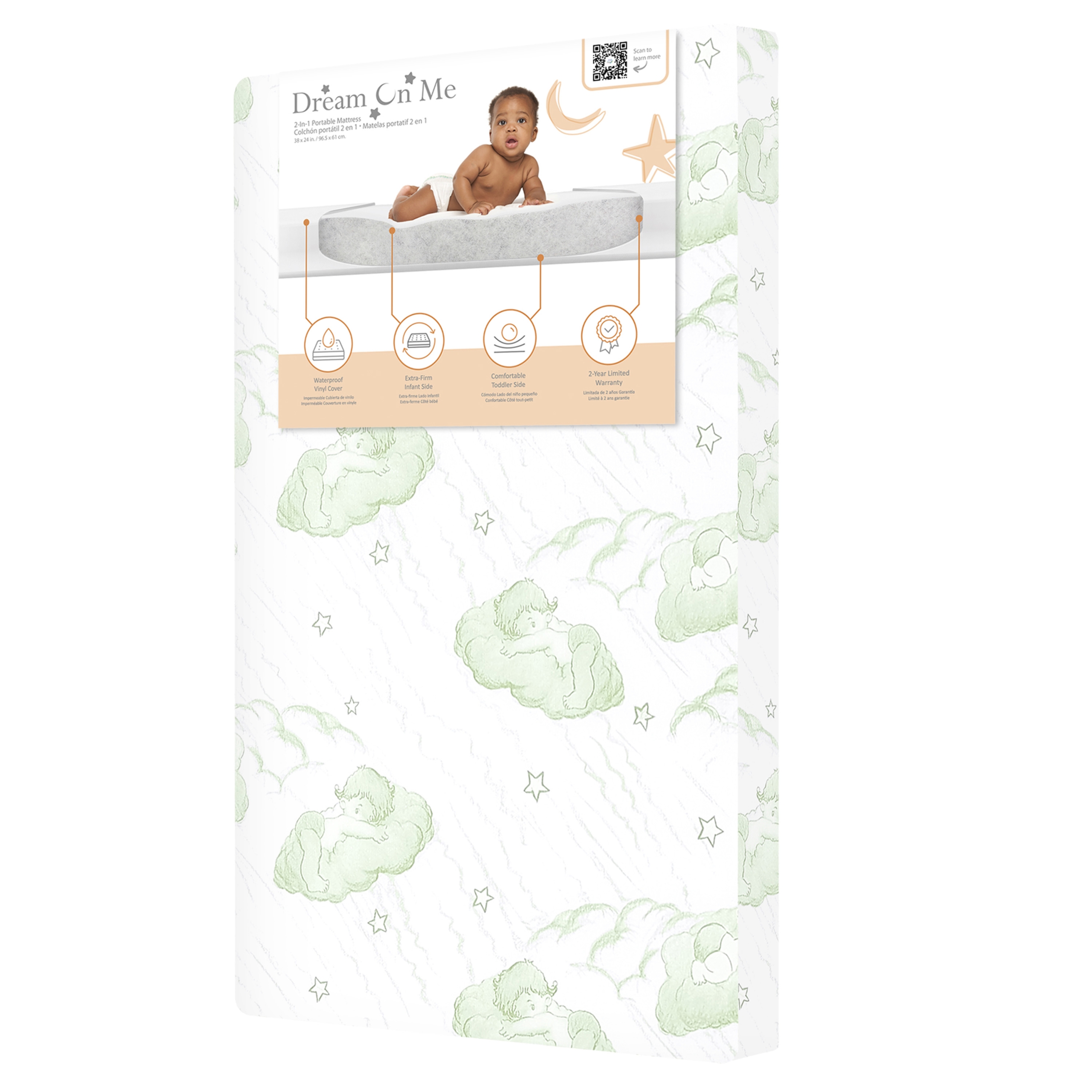 Let your bub experience comfort and safety in every layer! The Dream On Me Aster 3″ Fiber Portable Mini Crib Mattress is designed to give your little one the best sleep experience while ensuring their safety. With a 100% recycled polyester fiber core, this mattress provides extra firm support for infants and a comfortable surface for toddlers. Its lightweight design makes it easy to handle, while the waterproof vinyl cover ensures long-lasting durability. Backed by a 2-year limited warranty, this mattress is the perfect blend of sustainability, comfort, and protection. This wonderful mattress comes in a green vinyl finish with adorable green cloud prints all over. Product dimensions are 38” L x 24” W x 3” H.