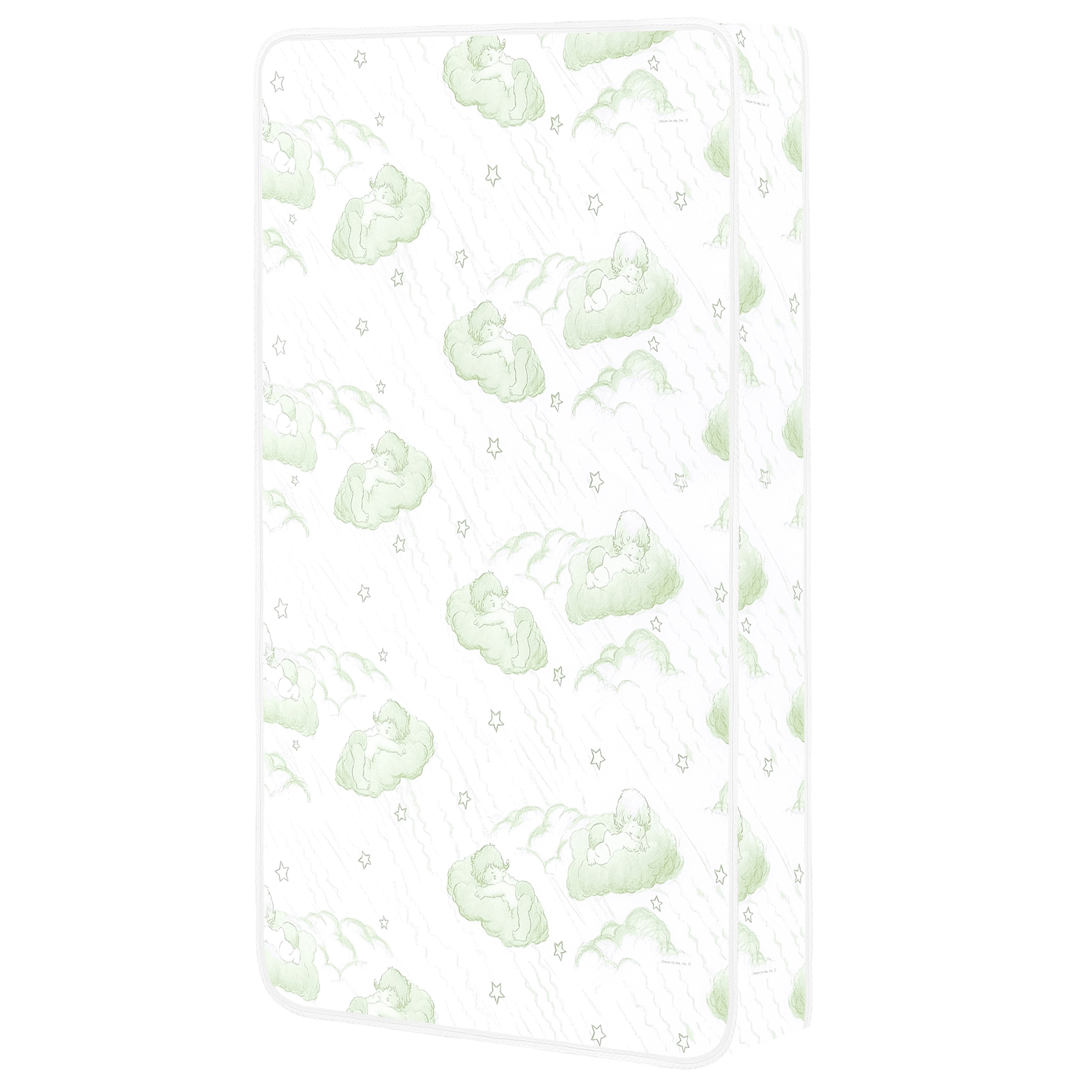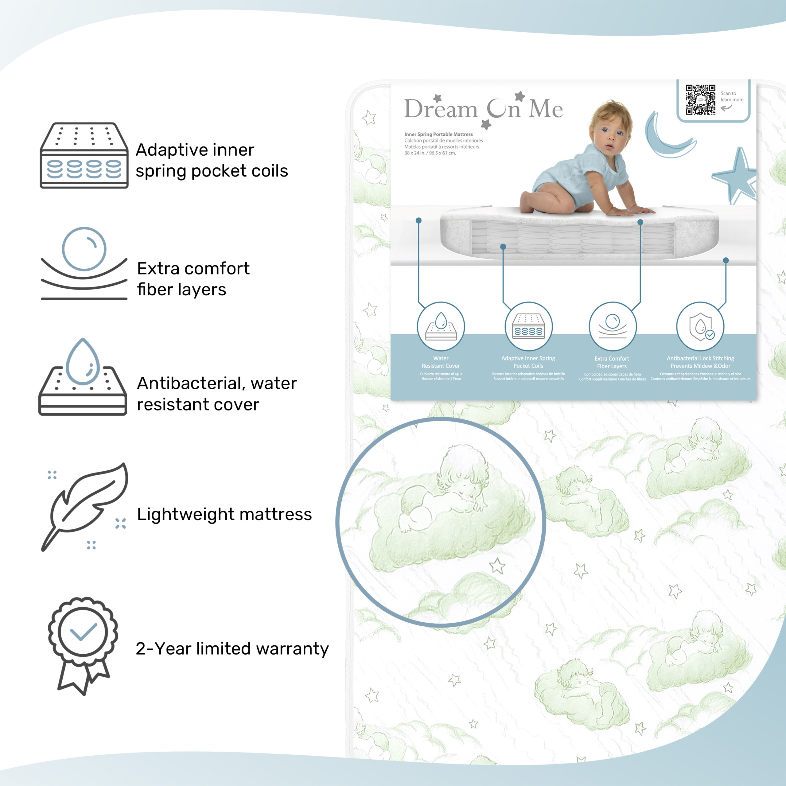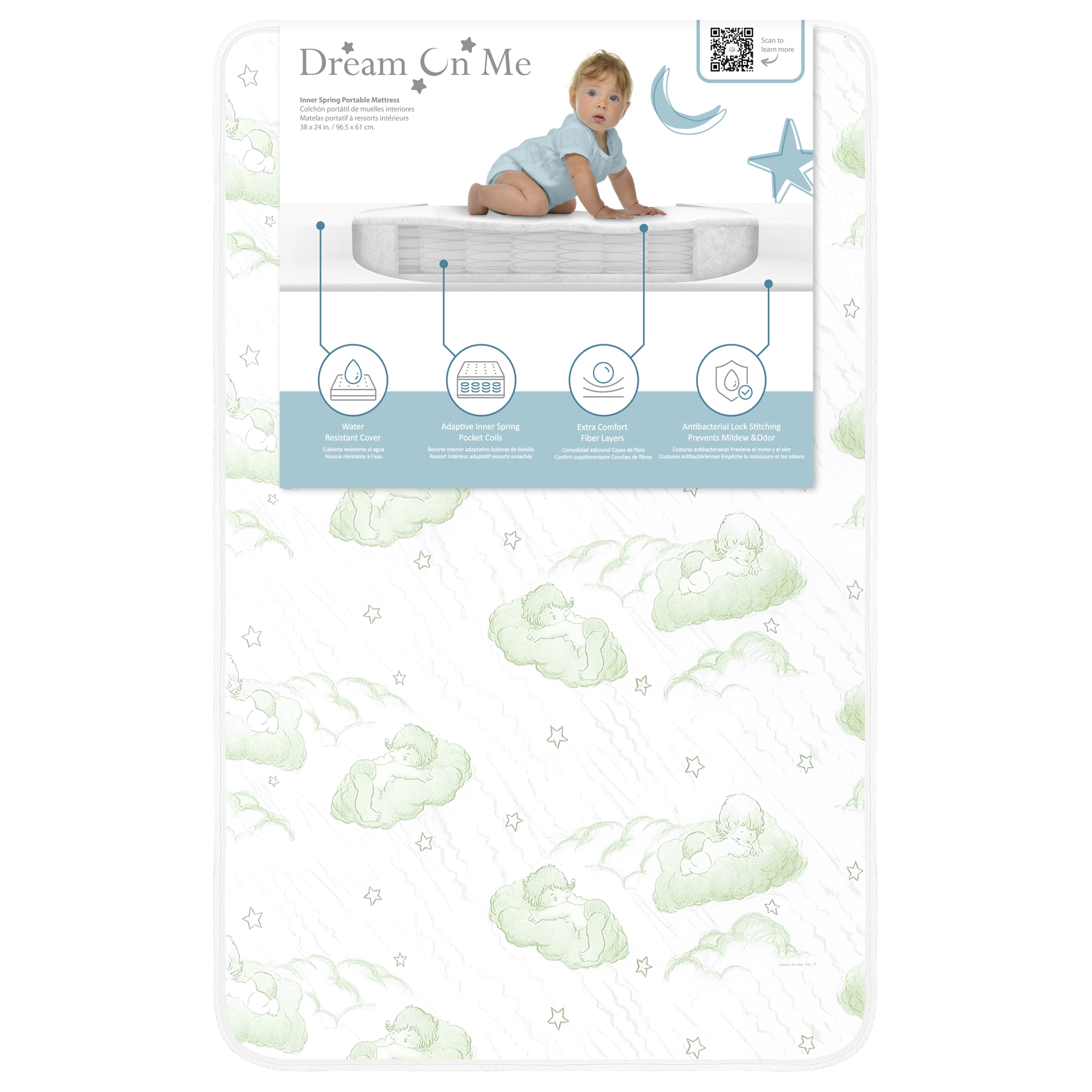 The Dream On Me Inner Spring Portable Mattress is the perfect choice for those early years with its mix of safety and comfort. It’s Greenguard Gold Certified to ensure optimum health and safety meets/exceeds all safety standards set by CPSC/ASTM & passes all flammability (16 CFR 1632/1633) tests. The lightweight, interwoven, heat tempered coils offer a firm foundation and excellent support for your growing baby. It features a soft embossed waterproof cover with Lock Stitched binding and a beige cloud design. Our mattresses are designed, engineered and proudly made in the USA using the best quality materials.
