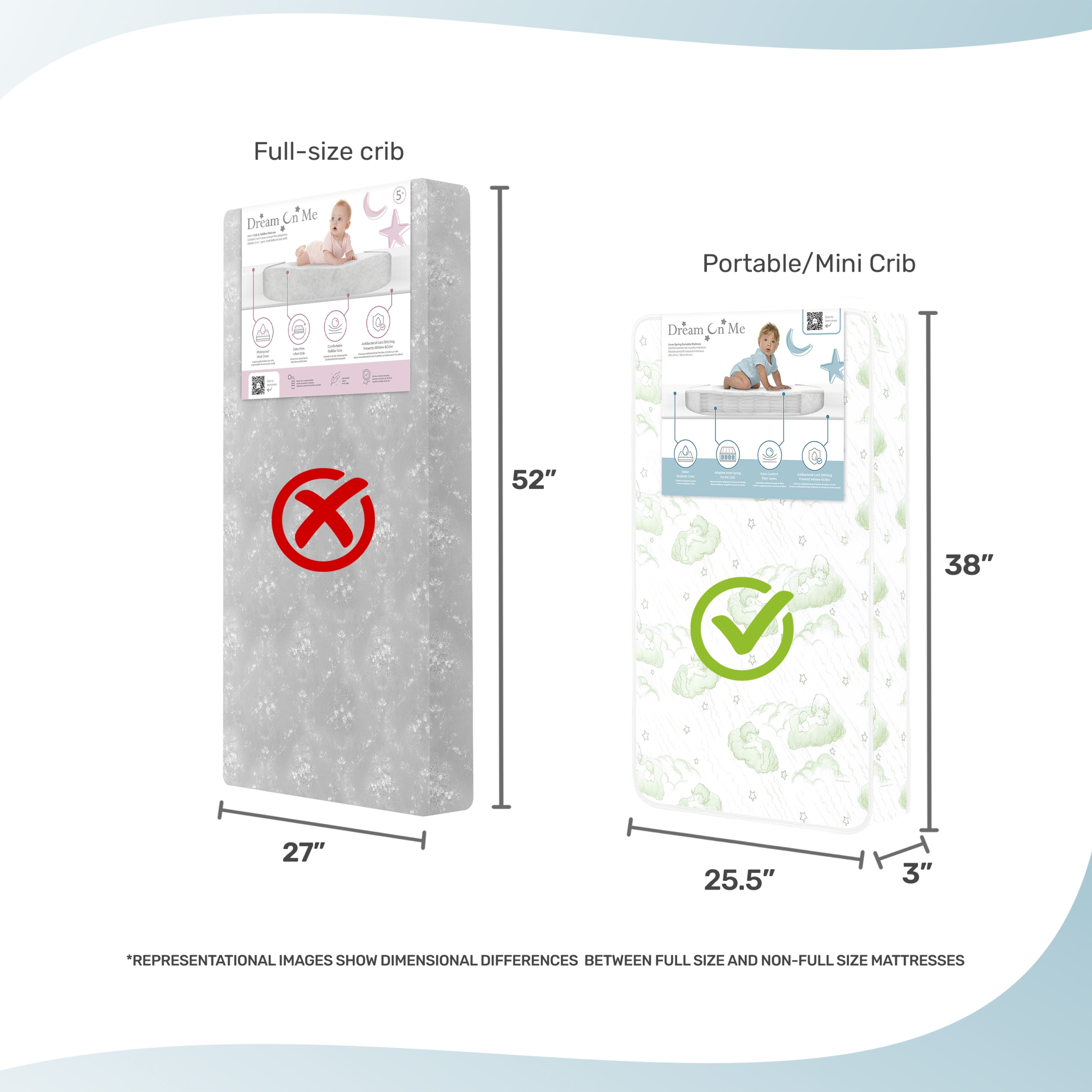 - Designed for mini and portable cribs: Mattress dimensions are 38 L x 25.5 W x 3 H inches. Fits most mini cribs and portable cribs. The durable, waterproof vinyl cover wipes clean with soap and water.